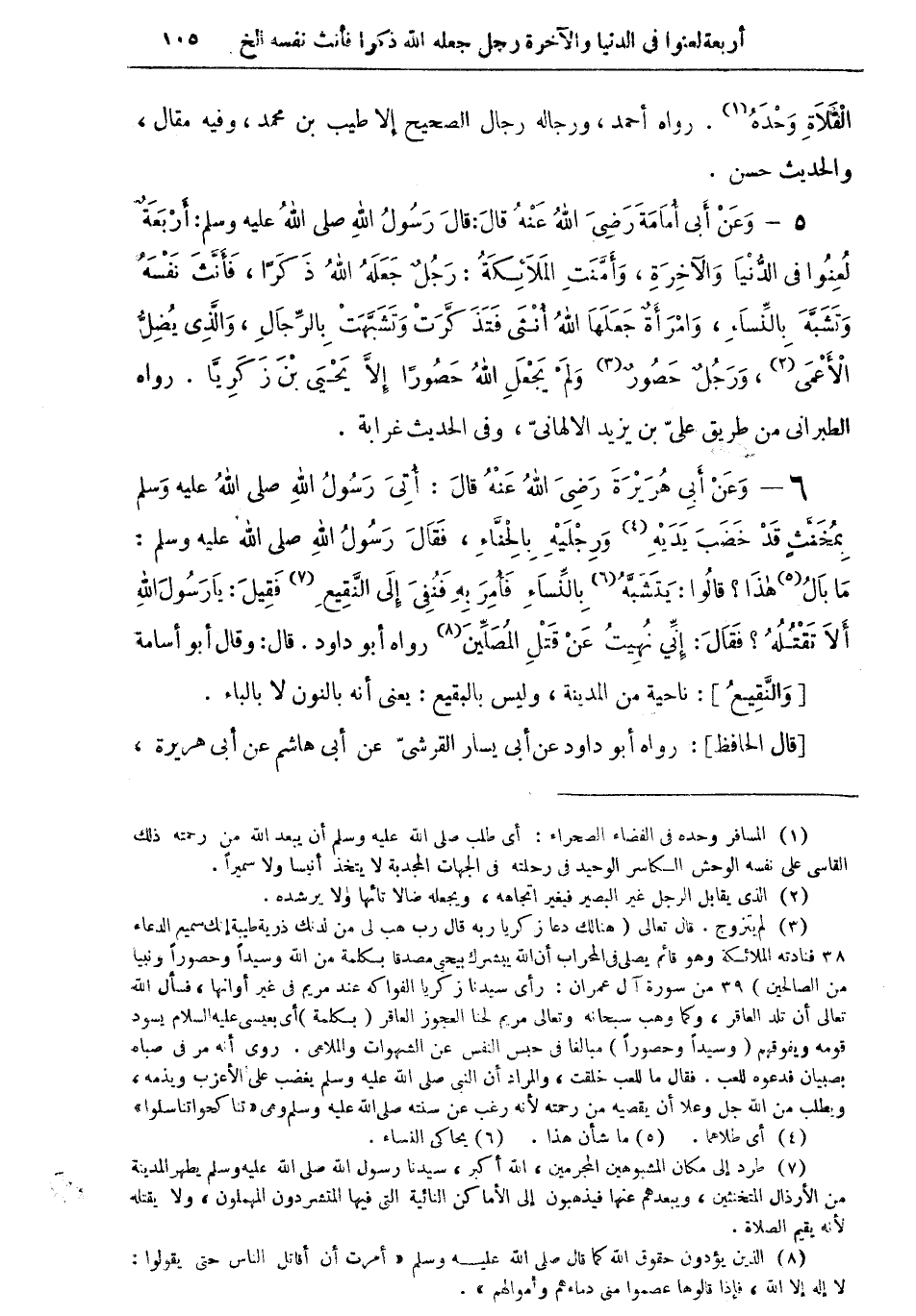5 - وعن أبي أمامة رضي الله عنه قال: قال رسول الله صلى الله عليه وسلم: "أربعةٌ لُعِنُوا في الدنيا والآخرة، وَأمَّنَتِ الملائكةُ: رجلٌ جعلهُ الله ذَكَراً، فأنَّثَ نفسهُ وتشبه بالنساء، وامرأةٌ جعلها الله أُنثى فَتَذَكَّرَتْ وتشبهت بالرجال، والذي يُضِلُّ الأعمى (¬2) ورجلٌ حَصُورٌ (¬3) ولم يجعلِ الله حصوراً إلا يَحْيىَ بن زكريا" رواه الطبراني من طريق علي بن يزيد الألهاني، وفي الحديث غرابة.