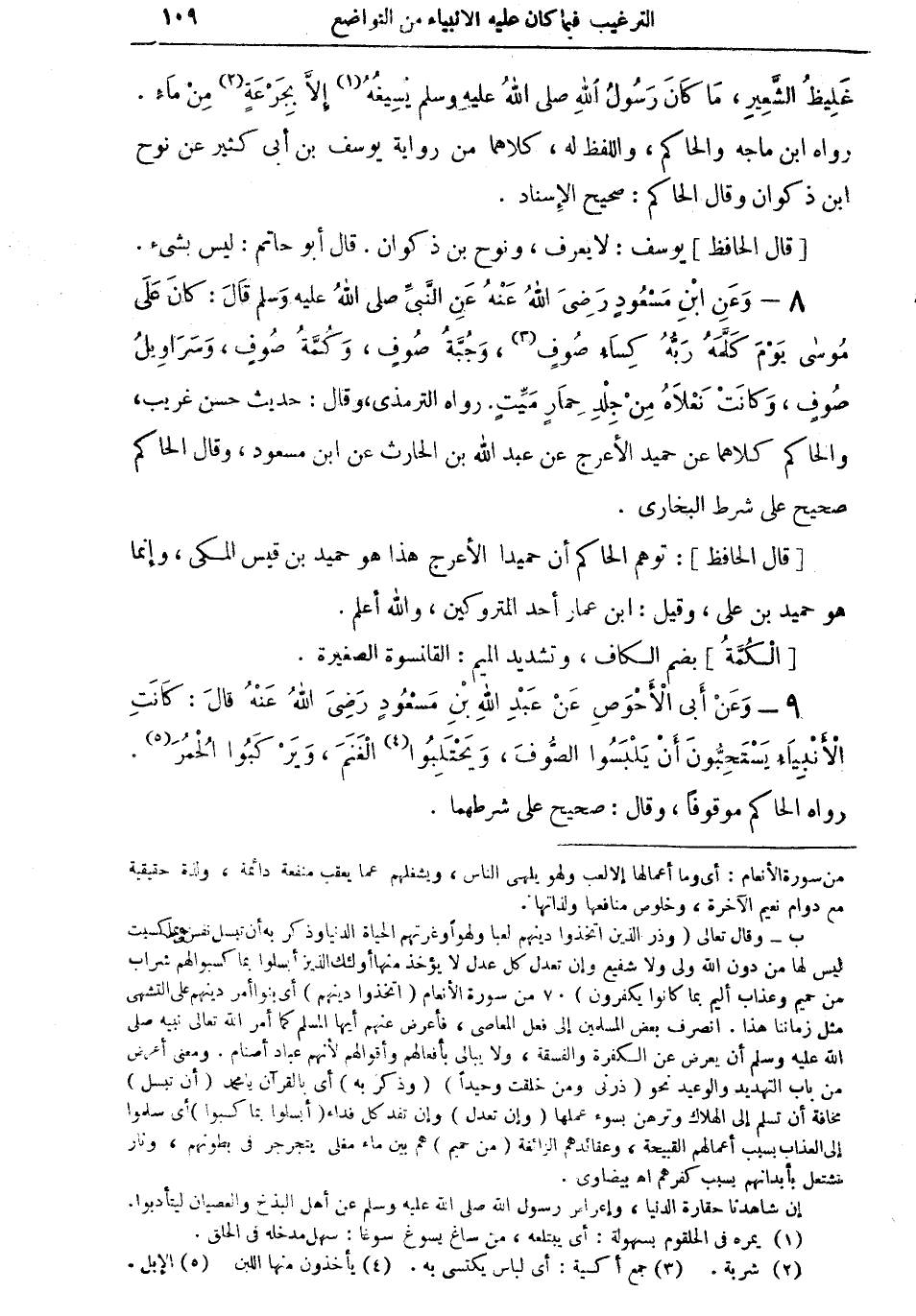 8 - وعن ابن مسعودٍ رضي الله عنه عن النبي صلى الله عليه وسلم قال: "كان على موسى يومَ كلَّمَهُ ربهُ كِسَاء صوفٍ (¬3) وجبةُ صوفٍ، وكُمَّةُ صُوفٍ، وسراويلُ صوفٍ، وكانت نعلاهُ من جلد حمارٍ ميتٍ" رواه الترمذي، وقال حديث حسن غريب، والحاكم كلاهما عن حميد الأعرج عن عبد الله بن الحارث عن ابن مسعود، وقال الحاكم: صحيح على شرط البخاري.