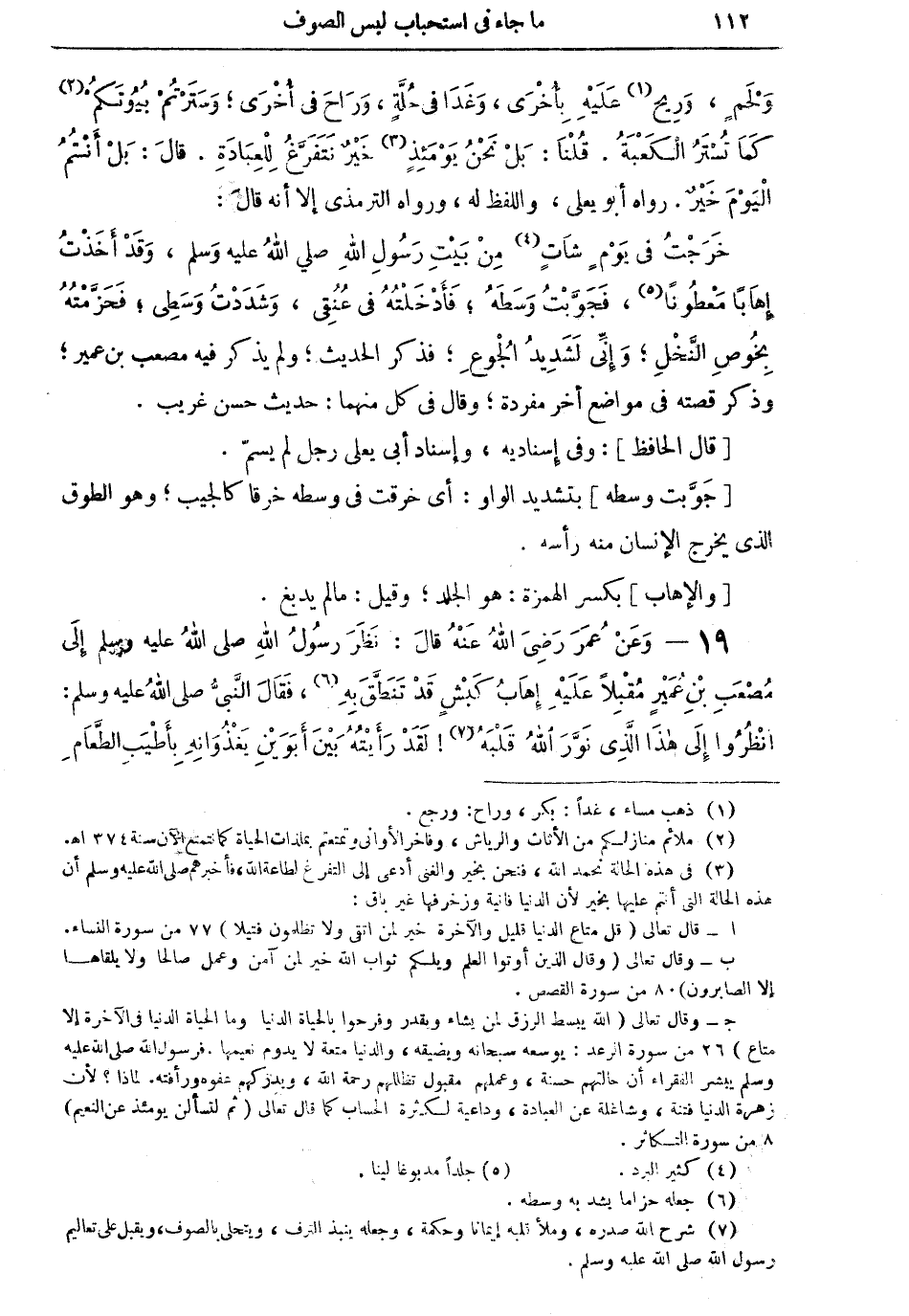 فجوَّبْتُ وسطهُ؛ فأدخلتهُ في عنقي، وشددتُ وسطي؛ فحزمتهُ بخُوصِ النخلِ، وإني لشديد الجوع؛ فذكر الحديث؛ ولم يذكر فيه مصعب بن عمير؛ وذكر قصته في مواضع أخر مفردة؛ وقال في كل منهما: حديث حسن غريب.