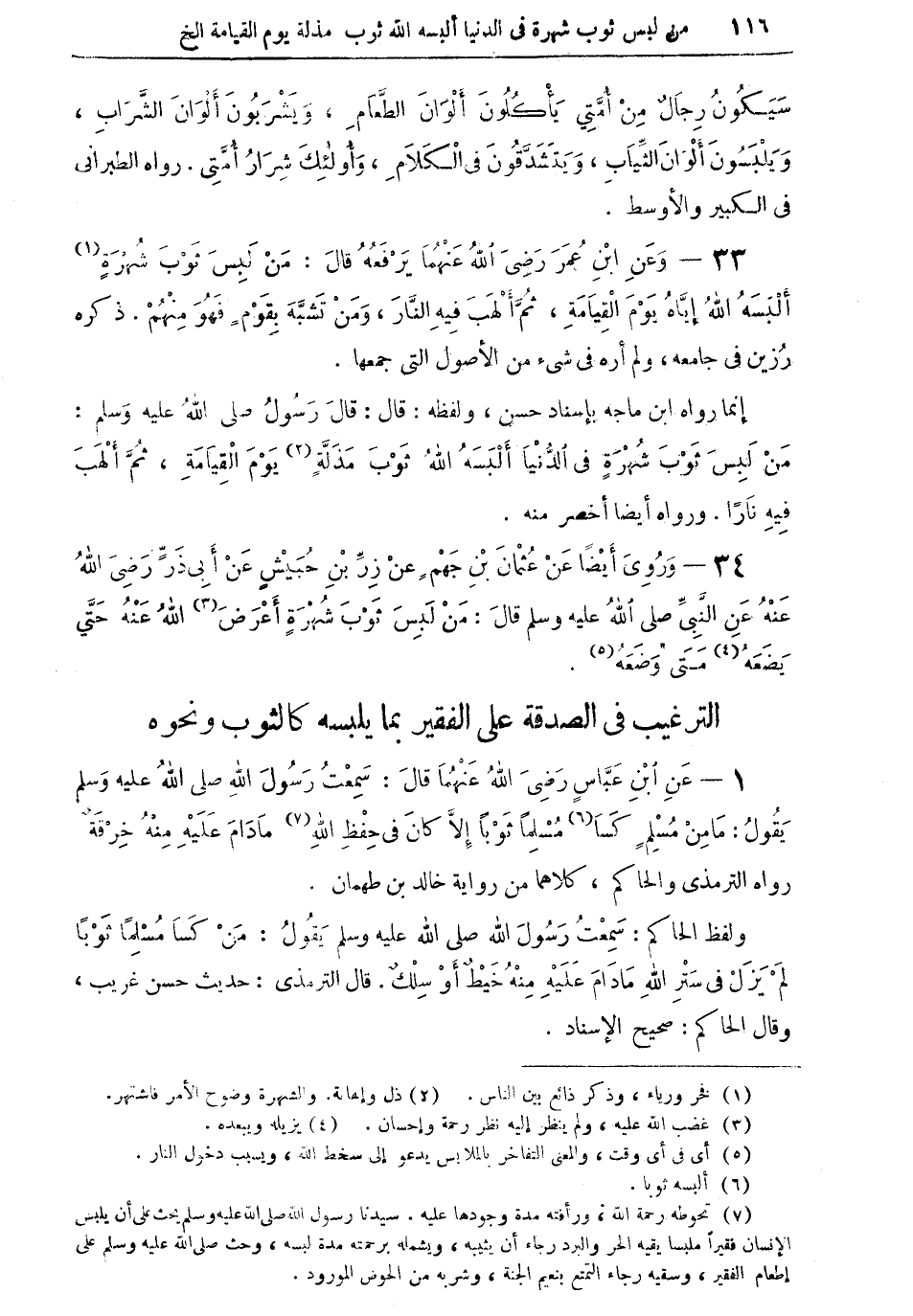 34 - ورويَ أيضاً عن عثمان بن جهمٍ عن زرِّ بن حُبيش عن أبي ذرٍ رضي الله عنه عن النبي صلى الله عليه وسلم قال: "من لبس ثوبَ شهرةٍ أعرضَ (¬3) الله عنه حتى يضعهُ (¬4) متى وضعه (¬5) ".