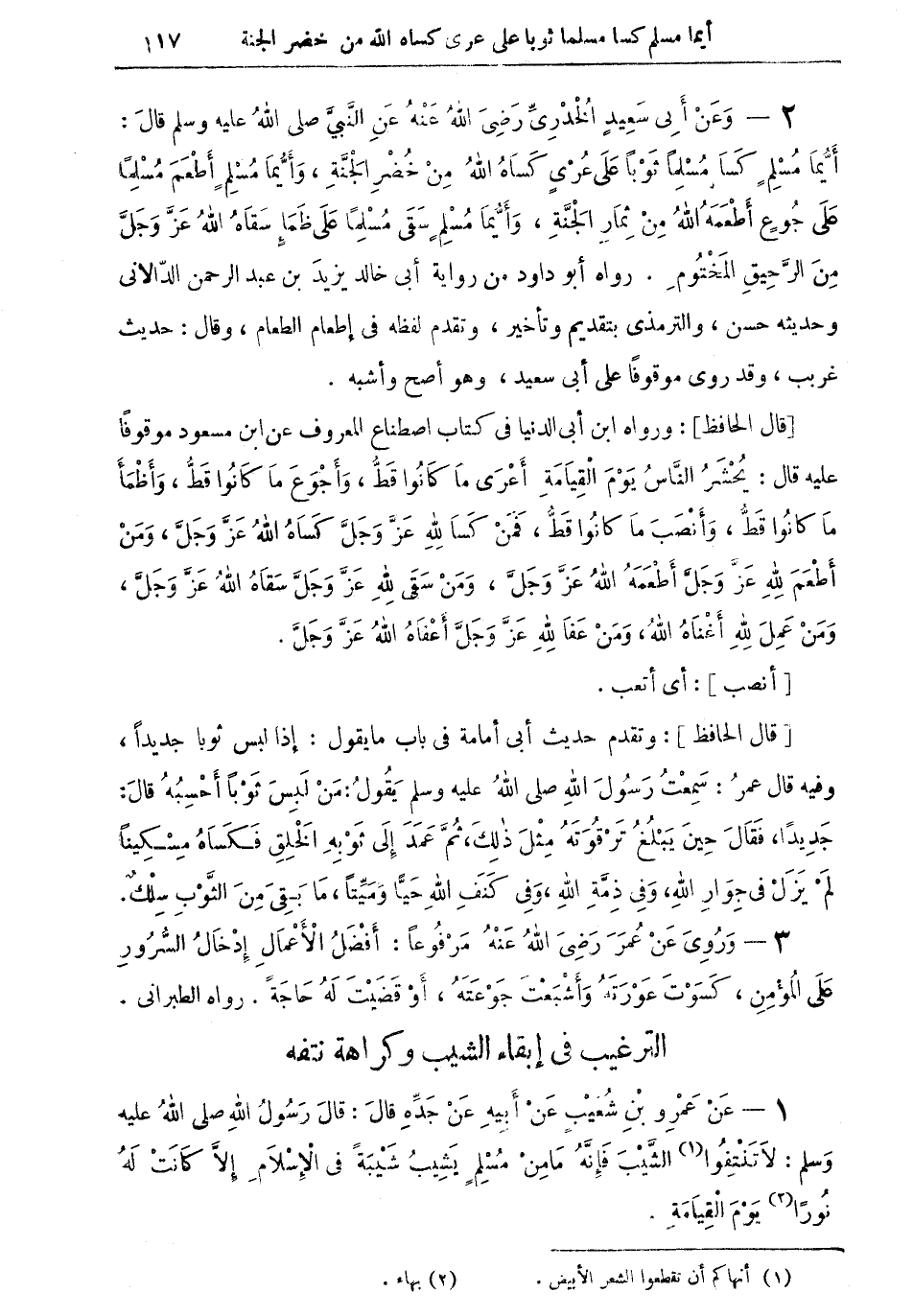 2 - وعن أبي سعيد الخدري رضي الله عنه عن النبي صلى الله عليه وسلم قال: "أيما مسلمٍ كسا مُسلماً ثوباً على عُريٍ كساهُ الله من خُضْرِ الجنة، وأيما مسلمٍ أطعم مُسلماً على جُوعٍ أطعمهُ الله من ثمار الجنة، وأيما مسلمٍ سقى مُسلماً على ظمأ سقاه الله عز وجل من الرحيق المختوم" رواه أبو داود من رواية أبي خالد يزيد ابن عبد الرحمن الدالاني، وحديثه حسن، والترمذي بتقديم وتأخير، وتقدم لفظه في إطعام الطعام، وقال: حديث غريب، وقد روي موقوفاً على أبي سعيد، وهو أصح وأشبه.