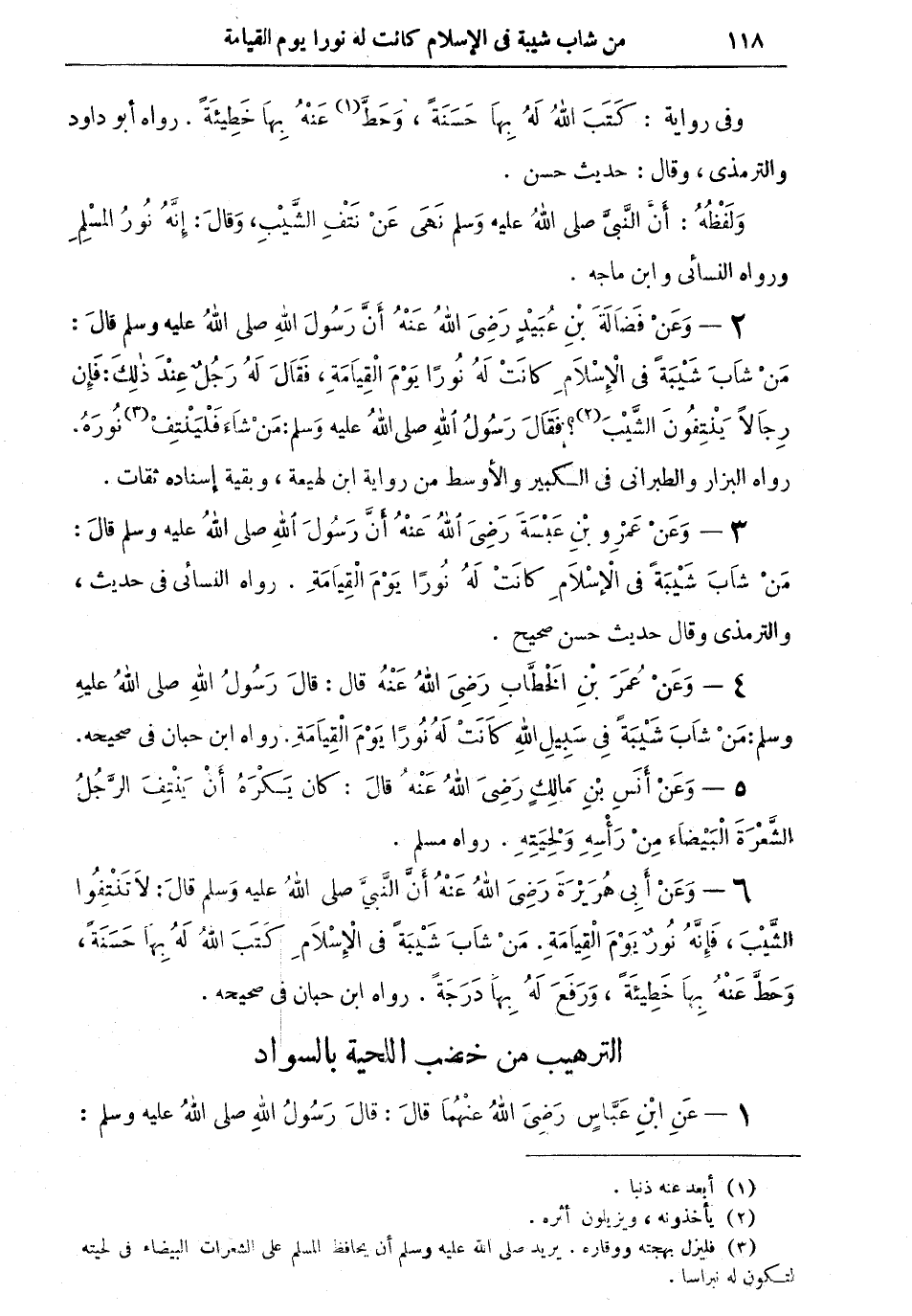 3 - وعن عمرو بن عبسة رضي الله عنه: أن رسول الله صلى الله عليه وسلم قال: "من شاب شيبةً في الإسلام كانت له نوراً يوم القيامة" رواه النسائي في حديث، والترمذي وقال: حديث حسن صحيح.