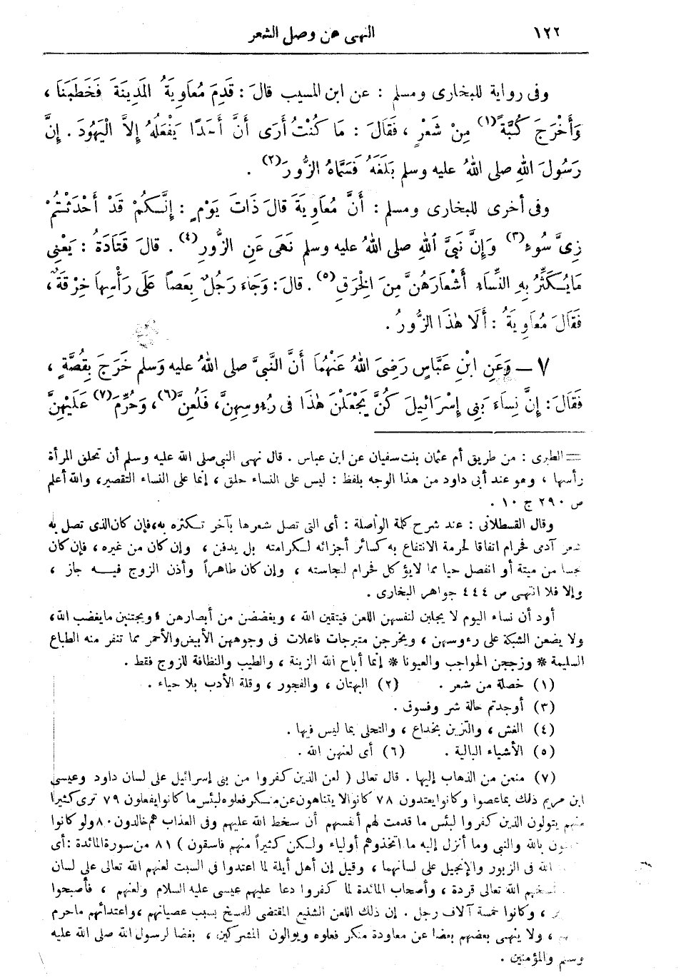 7 - وعن ابن عباس رضي الله عنهما: أن النبي صلى الله عليه وسلم خرج بقُصَّةٍ، فقال: إن نساء بني إسرائيل كُنَّ يجعلن هذا في رءوسهن، فَلُعِنَّ (¬6)، وَحُرِّمَ (¬7)