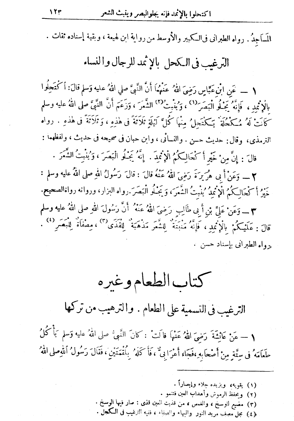 3 - وعن علي بن أبي طالب رضي الله عنه أن رسول الله صلى الله عليه وسلم قال: "عليكم بالإثمدِ، فإنه مَنبتةٌ للشعر مَذْهَبَةٌ للقذى (¬3)، مصفاةٌ للبصر (¬4) " رواه الطبراني بإسناد حسن.