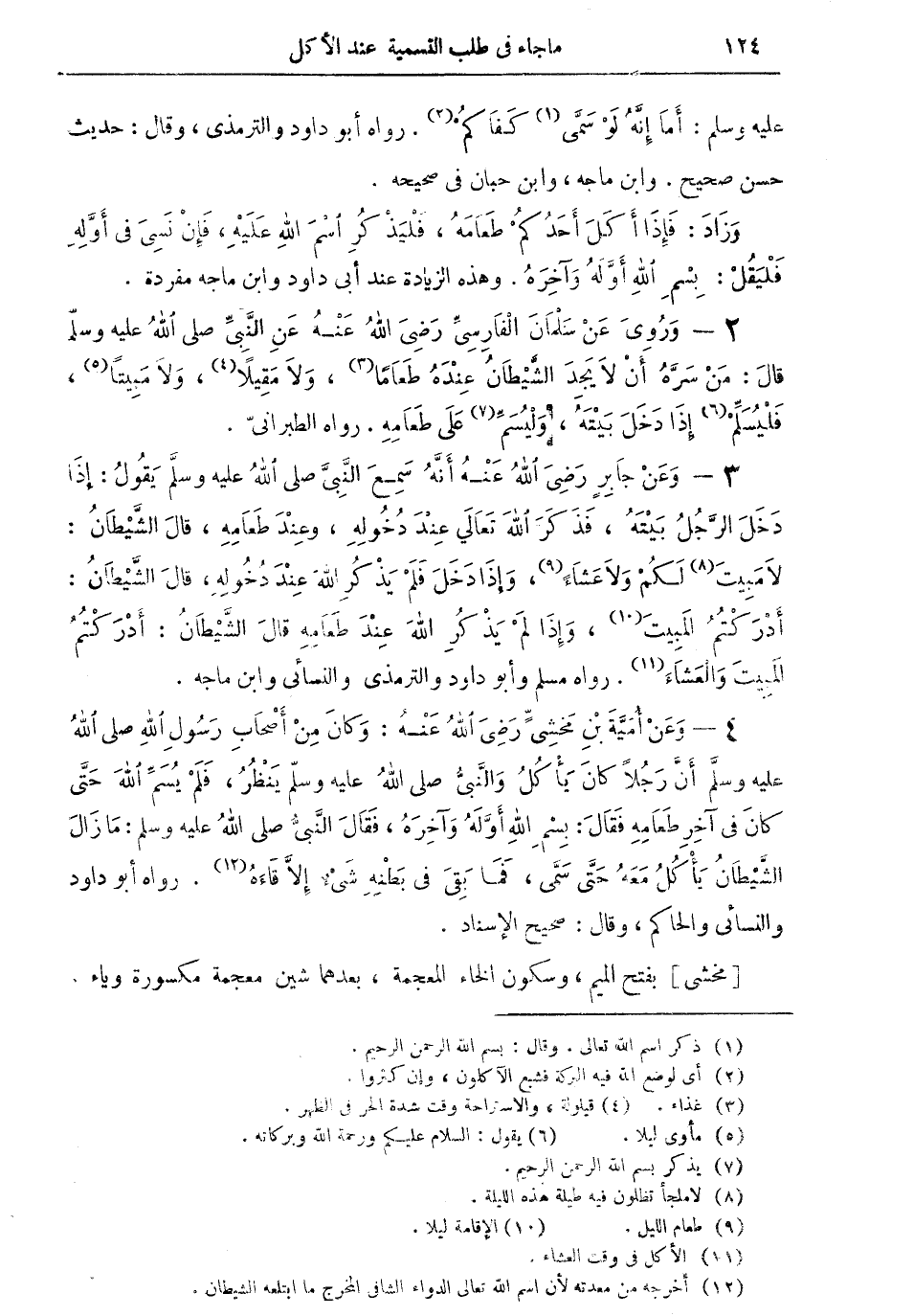 4 - وعن أمية بن مَخْشِيٍّ رضي الله عنه: "وكان من أصحاب رسول الله صلى الله عليه وسلم أن رجلاً كان يأكلُ، والنبي صلى الله عليه وسلم ينظرُ، فلم يُسَمِّ الله حتى كان في آخر طعامه فقال: بسم الله أوَّلَهُ وآخِرَهُ، فقال النبي صلى الله عليه وسلم: مازال الشيطان يأكلُ، معه حتى سَمَّى، فما بقي في بطنه شيء إلا قاءهُ (¬12) " رواه أبو داود والنسائي والحاكم، وقال: صحيح الإسناد.