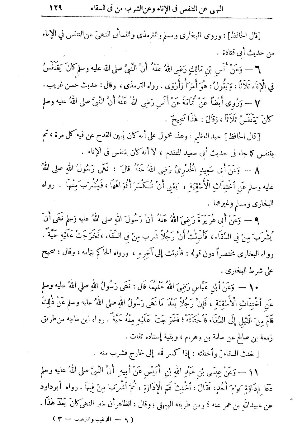 9 - وعن أبي هريرة رضي الله عنه أن رسول الله صلى الله عليه وسلم: "نهى أن يُشرب مِنْ فِي السِّقَاء، فأنبئتُ أن رجلاً شرب مِنْ فِي السِّقاء، فخرجت عليه حَيَّةٌ" رواه البخاري مختصراً دون قوله: فأنبئت إلى آخره، ورواه الحاكم بتمامه، وقال: صحيح على شرط البخاري.