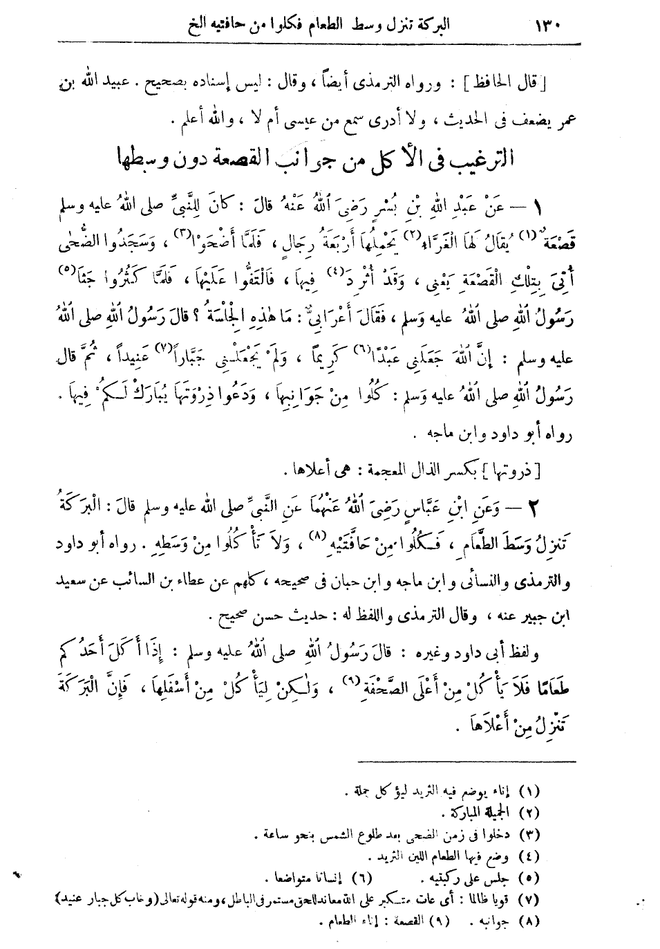 2 - وعن ابن عباس رضي الله عنههما: عن النبي صلى الله عليه وسلم قال: "البركة تنزلُ وسط الطعام، فكلوا من حافتيه (¬8)، ولا تأكلوا من وسطه" رواه أبو داود والترمذي والنسائي وابن ماجة وابن حبان في صحيحه، كلهم عن عطاء بن السائب عن سعيد بن جبير عنه، وقال الترمذي واللفظ له: حديث حسن صحيح.