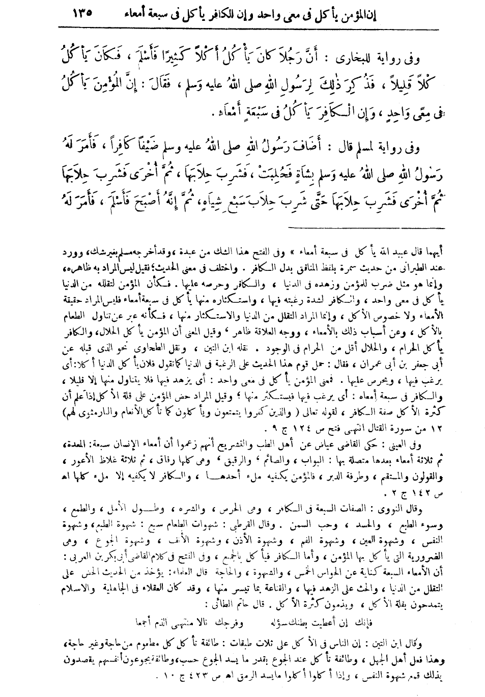 وفي رواية للبخاري: "أن رجلاً كان يأكلُ أكلاً كثيراً فأسلمَ، فكان يأكلُ أكلاً قليلاً، فَذُكِرَ ذلك لرسول الله صلى الله عليه وسلم، فقال: إن المؤمن يأكل في معي واحدٍ، وإن الكافر يأكل في سبعة أمعاء".