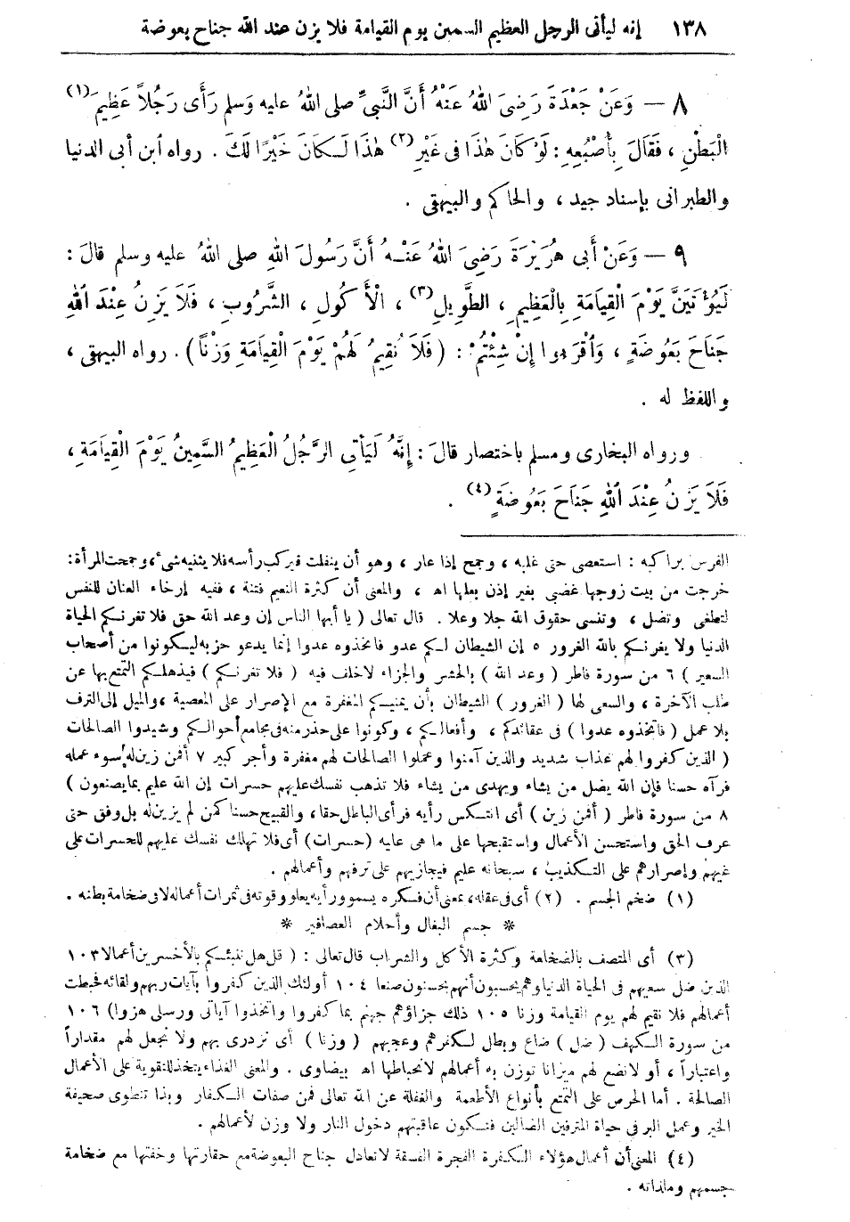 (¬3) أي المتصف بالضخامة وكثرة الأكل والشراب قال تعالى: "قل هل ننبئكم بالأخسرين أعمالاً الذين ضل سعيهم في الحياة الدنيا وهم يحسبون أنهم يحسنون صنعاً أولئك الذين كفروا بآيات ربهم ولقائه فحبطت أعمالهم فلا نقيم لهم يوم القيامة وزناً ذلك جزاؤهم جهنم بما كفروا واتخذوا آياتي ورسلي هزواً" (103 - 106 من سورة الكهف)، (ضل) ضاع وبطل لكفرهم وعجبهم (وزناً) أي نزدري بهم ولا نجعل لهم مقداراً واعتباراً، أو لا نضع لهم ميزاناً توزن به أعمالهم لانحباطها. أ. هـ. بيضاوي، والمعنى الغذاء يتحول للتقوية على الأعمال الصالحة، أما الحرص على التمتع بأنواع الأطعمة والغفلة عن الله تعالى فمن صفات الكفار وبذا تنطوي صحيفة الخير وعمل البر في حياة المترفين الضالين فتكون عاقبتهم دخول النار ولا وزن لأعمالهم.