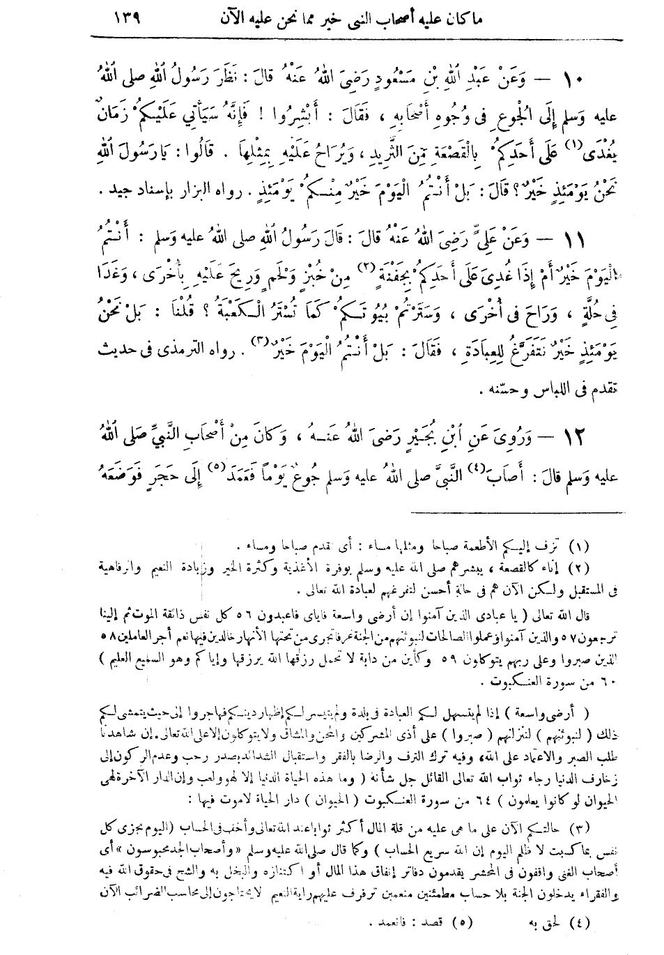 (¬2) إناء كالقصعة، يبشرهم صلى الله عليه وسلم بوفرة الأغذية وكثرة الخير وزيادة النعيم والرفاهية في المستقبل ولكن الآن هم في حالة أحسن لتفرغهم لعبادة الله تعالى. قال تعالى: "يا عبادي الذين آمنوا إن أرضي واسعة فإياي فاعبدون كل نفس ذائقة الموت ثم إلينا ترجعون والذين آمنوا وعملوا الصالحات لنبوئنهم من الجنة غرفاً تجري من تحتها الأنهار خالدين فيها نعم أجر العاملين الذين صبروا وعلى ربهم يتوكلون وكأين من دابة لا تحمل رزقها الله يرزقها وإياكم وهو السميع العليم" (56 - 60 من سورة العنكبوت)، (أرضي واسعة) إذا لم يتسهل لكم العبادة في بلدة ولم يتيسر لكم إظهار دينكم فهاجروا إلى حيث يتمشى لكم ذلك (لنبوئنهم) لننزلنهم (صبروا) على أذى المشركين والمحن والمشاق ولا يتوكلون إلا على الله تعالى. إن شاهدنا طلب الصبر والاعتماد على الله، وفيه ترك الترف والرضا بالفقر واستقبال الشدائد بصدر رحب وعدم الركون إلى زخارف الدنيا رجاء ثواب الله تعالى القائل جل شأنه "وما هذه الحياة الدنيا إلا لهو ولعب وإن الدار الآخرة لهي الحيوان لو كانوا يعلمون" (64 من سورة العنكبوت)، (الحيوان) دار الحياة لا موت فيها.