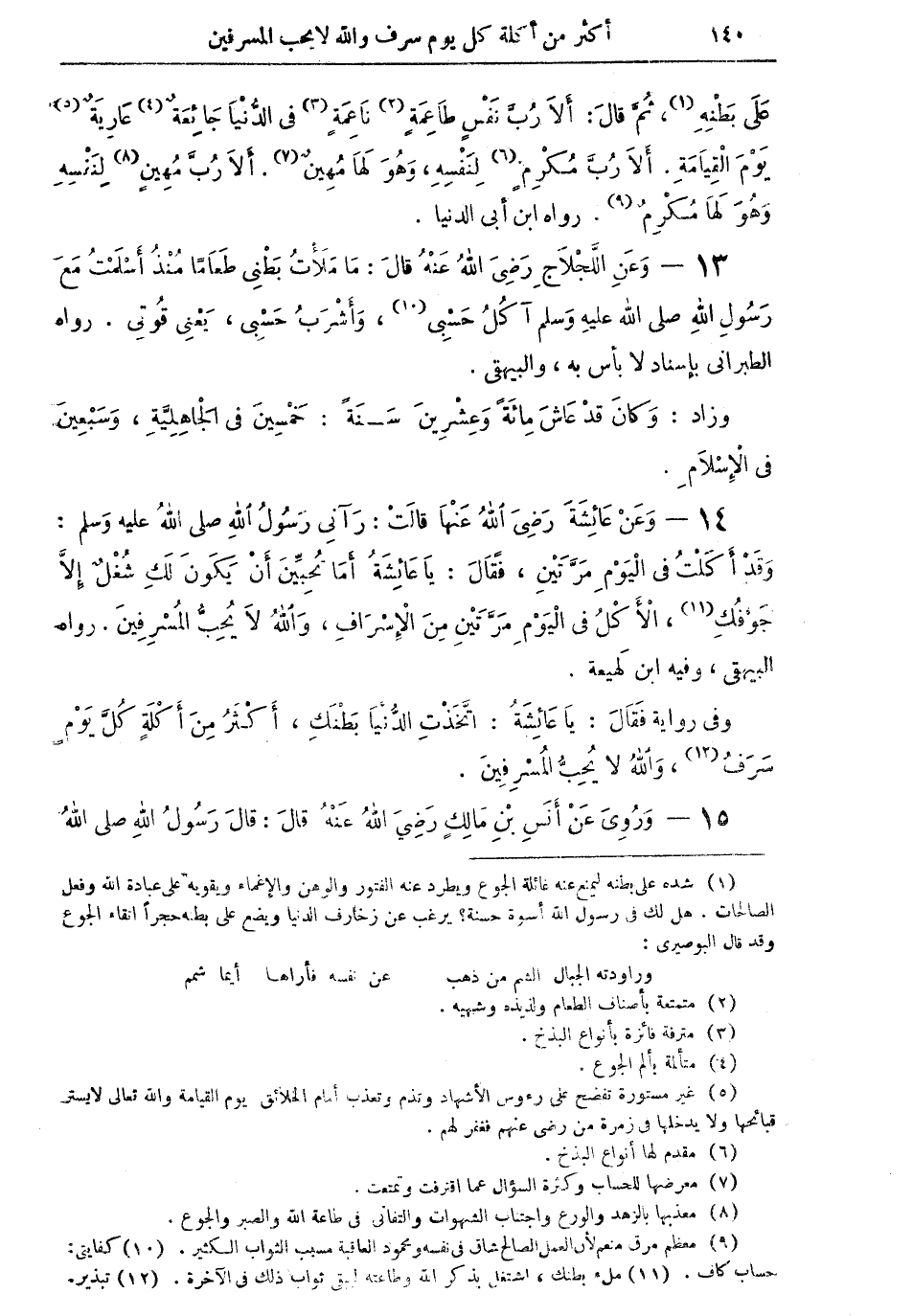 14 - وعن عائشة رضي الله عنها قالت: "رآني رسول الله صلى الله عليه وسلم وقد أكلتُ في اليوم مرتين، فقال: يا عائشة أما تُحبينَ أن يكون لك شُغلٌ إلا جوفكِ (¬11)، الأكلُ في اليوم مرتين من الإسراف، والله لا يحب المسرفين" رواه البيهقي، وفيه ابن لهيعة. وفي رواية فقال: يا عائشة اتخذت الدنيا بطنك، أكثرُ من أكلةٍ كلَّ يومٍ سَرَفٌ (¬12)، والله لا يحب المسرفين.