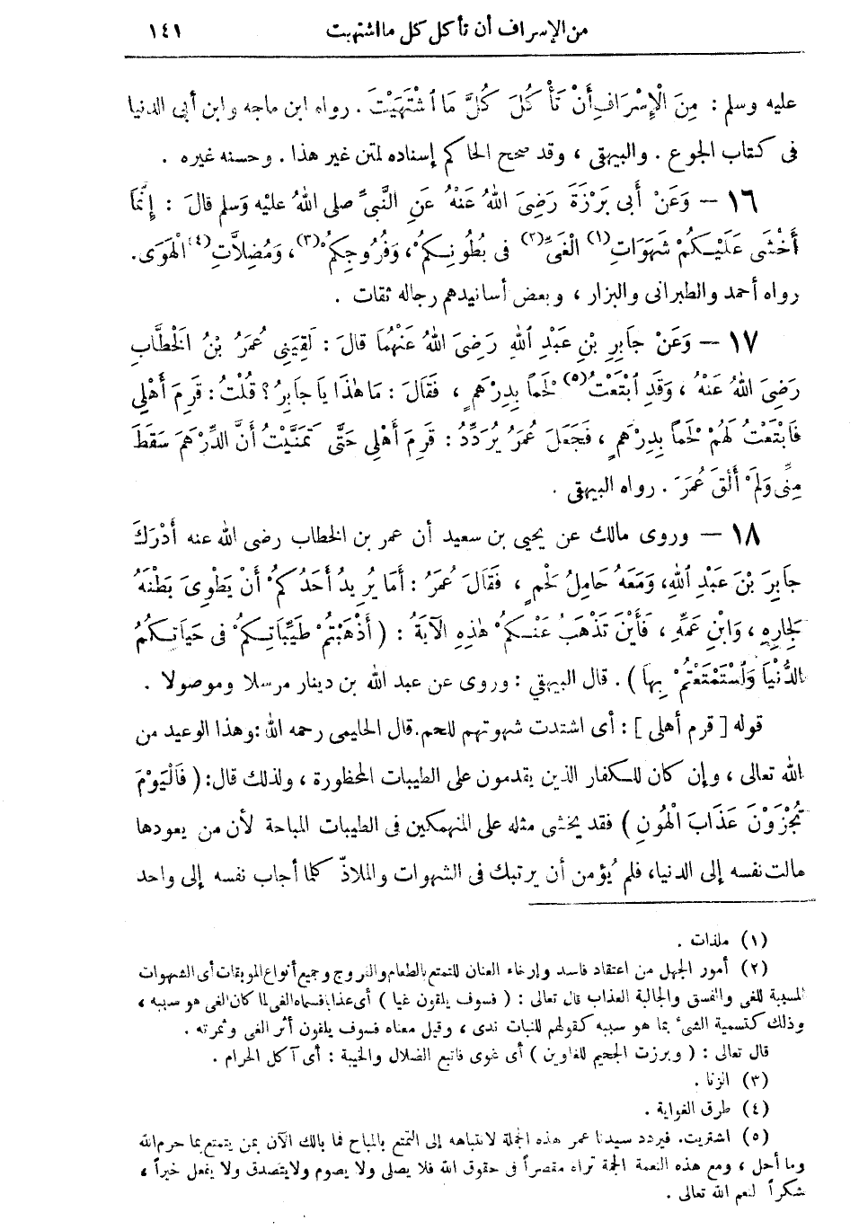 18 - وروى مالك عن يحيى بن سعيد: "أن عمر بن الخطاب رضي الله عنه أدرك جابر بن عبد الله، ومعه حاملُ لحمٍ، فقال عمر: أما يريد أحدكم أن يطويَ بطنه لجاره، وابن عمه، فأين تذهبُ عنكم هذه الآية "أذْهَبْتُمْ طَيِّبَاتِكُمْ في حَيَاتِكُمُ الدُّنْيَا وَاسْتَمْتَعْتُمْ بها" قال البيهقي: وروى عن عبد الله بن دينار مرسلاً وموصولاً.