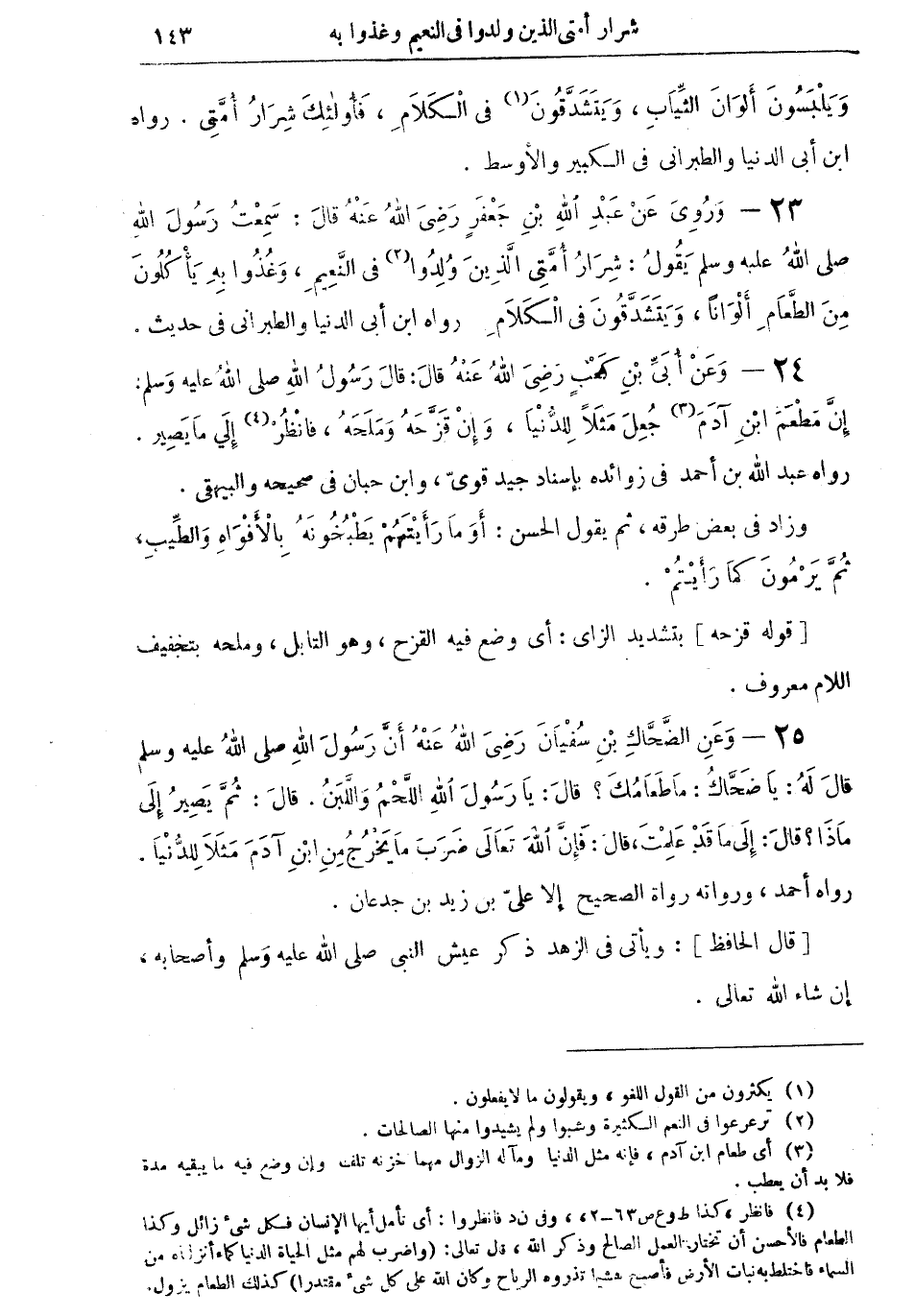 23 - ورويَ عن عبد الله بن جعفر رضي الله عنه قال: "سمعت رسول الله صلى الله عليه وسلم يقول: شرار أمتي الذين ولدوا (¬2) في النعيم، وغُذُوا به يأكلون من الطعام ألواناً، ويتشدقون في الكلام" رواه ابن أبي الدنيا والطبراني في حديث.