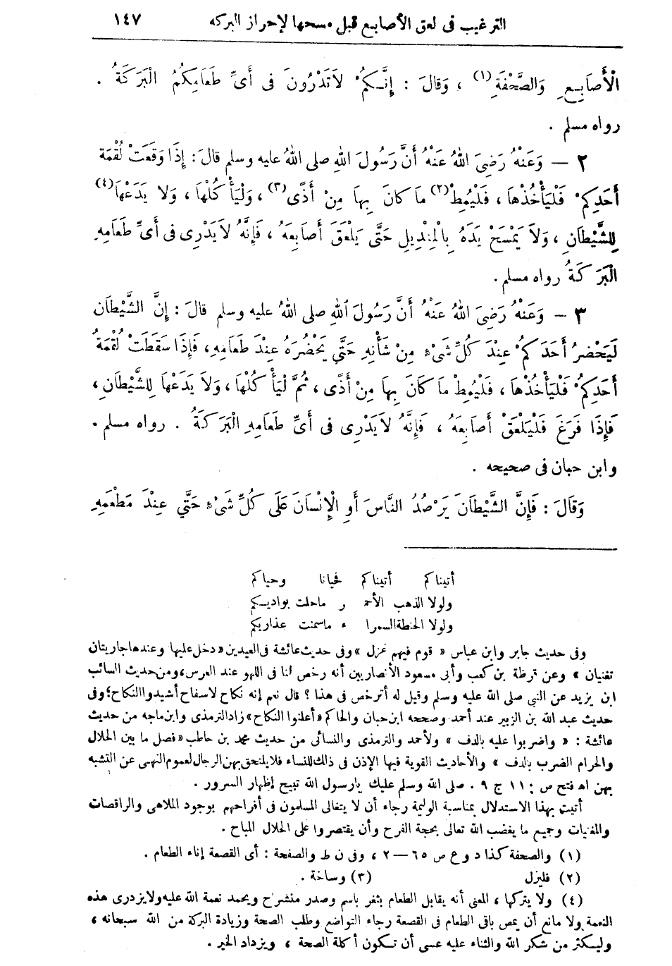 3 - وعنه رضي الله عنه أن رسول الله صلى الله عليه وسلم قال: إن الشيطان ليحضرُ أحدكم عند كل شيء من شأنه حتى يَحْضُرَهُ عند طعامه، فإذا سقطت لقمة أحدكم فليأخذها، فليمط ما كان بها من أذىً، ثم ليأكلها، ولا يدعها للشيطان، فإذا فرغ فليلعق أصابعهُ، فإنه لا يدري في أي طعامه البركة" رواه مسلم وابن حبان في صحيحه، وقال: فإن الشيطان يرْصُدُ الناس أو الإنسان على كل شيء حتى عند مطعمهِ