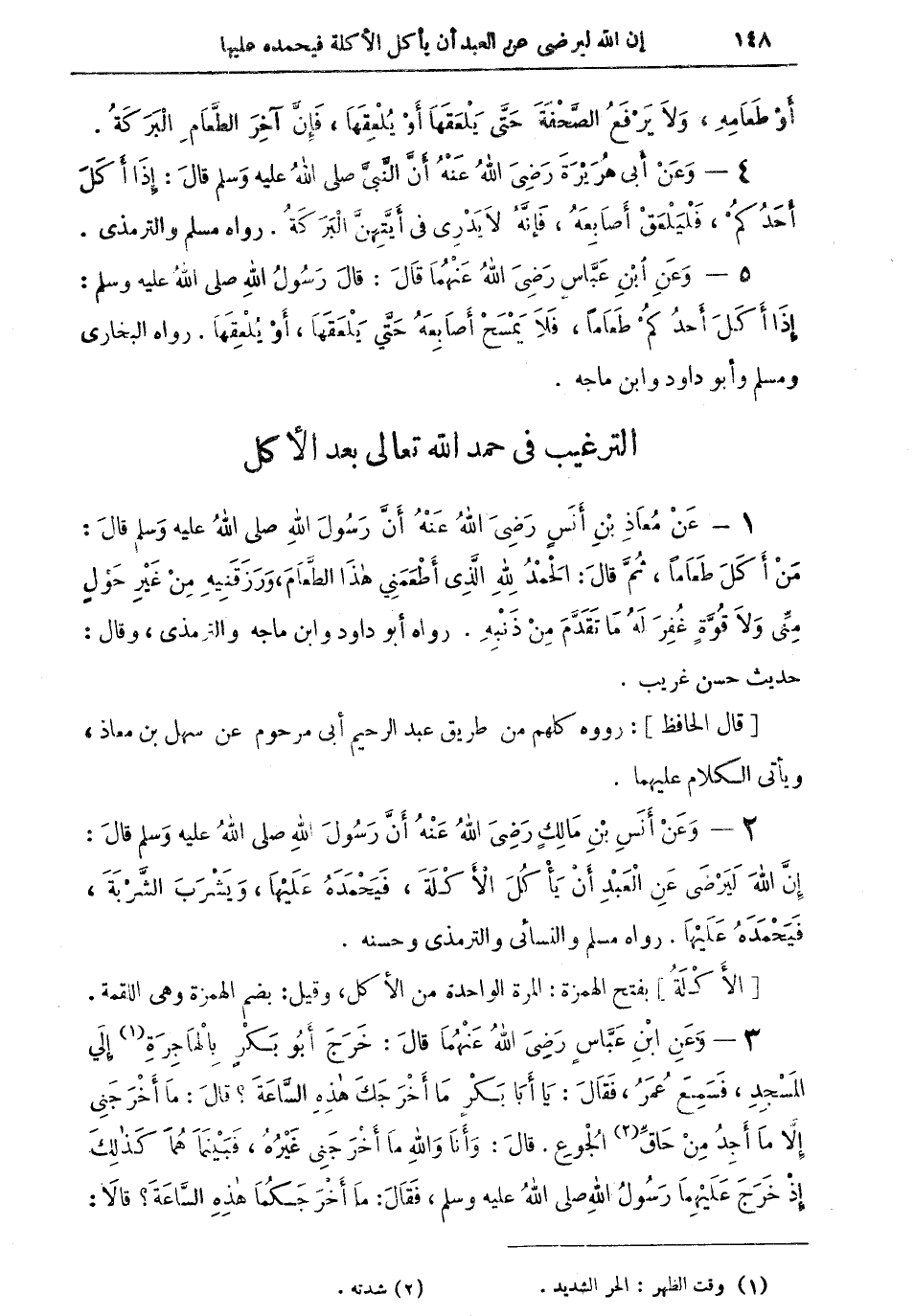 2 - وعن أنسٍ بن مالكٍ رضي الله عنه أن رسول الله صلى الله عليه وسلم قال: "إن الله ليرضى عن العبد أن يأكل الأكلةَ، فيحمدهُ عليها، ويشرب الشربةَ، فيحمدهُ عليها" رواه مسلم والنسائي والترمذي وحسنه.