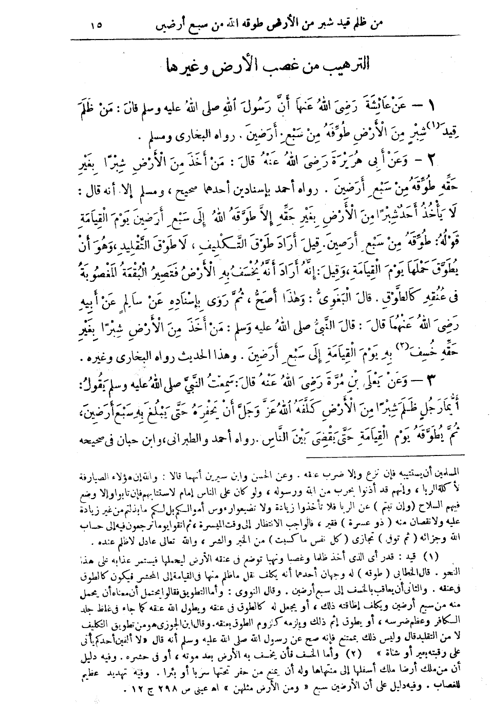 2 - وعن أبي هريرة رضي الله عنه قال: "من أخذ من الأرض شبراً بغير حقه طُوِّقَهُ من شبع أرضين" رواه أحمد بإسنادين أحدهما صحيح، ومسلم إلا أنه قال: "لا يأخذ أحدٌ شبراً من الأرض بغير حقه إلا طوقه الله إلى سبع أرضين يوم القيامة" قوله: طُوِّقَهُ من سبع أرضين. قيل أرد طَوْقَ التكليف، لا طوق التقليد، وهو أن يُطَوَّقَ حملها يوم القيامة، وقيل: إنه أراد أنه يخسف به الأرض فتصير البقعة المغصوبة في عنقه كالطوق. قال البغوي: وهذا أصح، ثم روى بإسناده عن سالم عن أبيه رضي الله عنهما قال: "قال النبي صلى الله عليه وسلم: من أخذ من الأرض شبراً بغير حقه خُسِفَ (¬2)