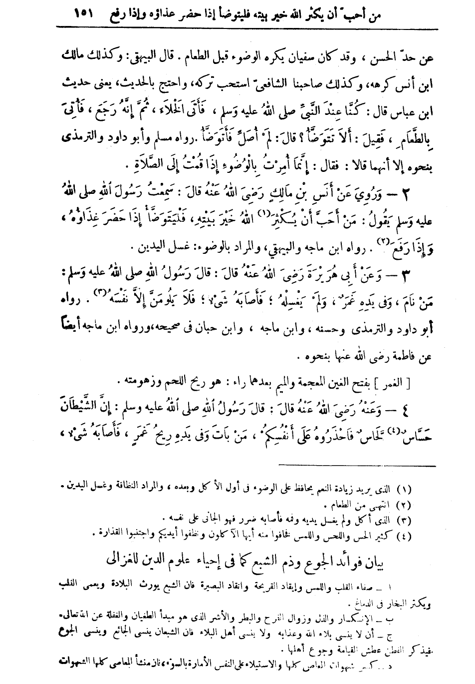 (¬1) الذي يريد زيادة النعم يحافظ على الوضوء في أول الأكل وبعده، والمراد النظافة وغسل اليدين.