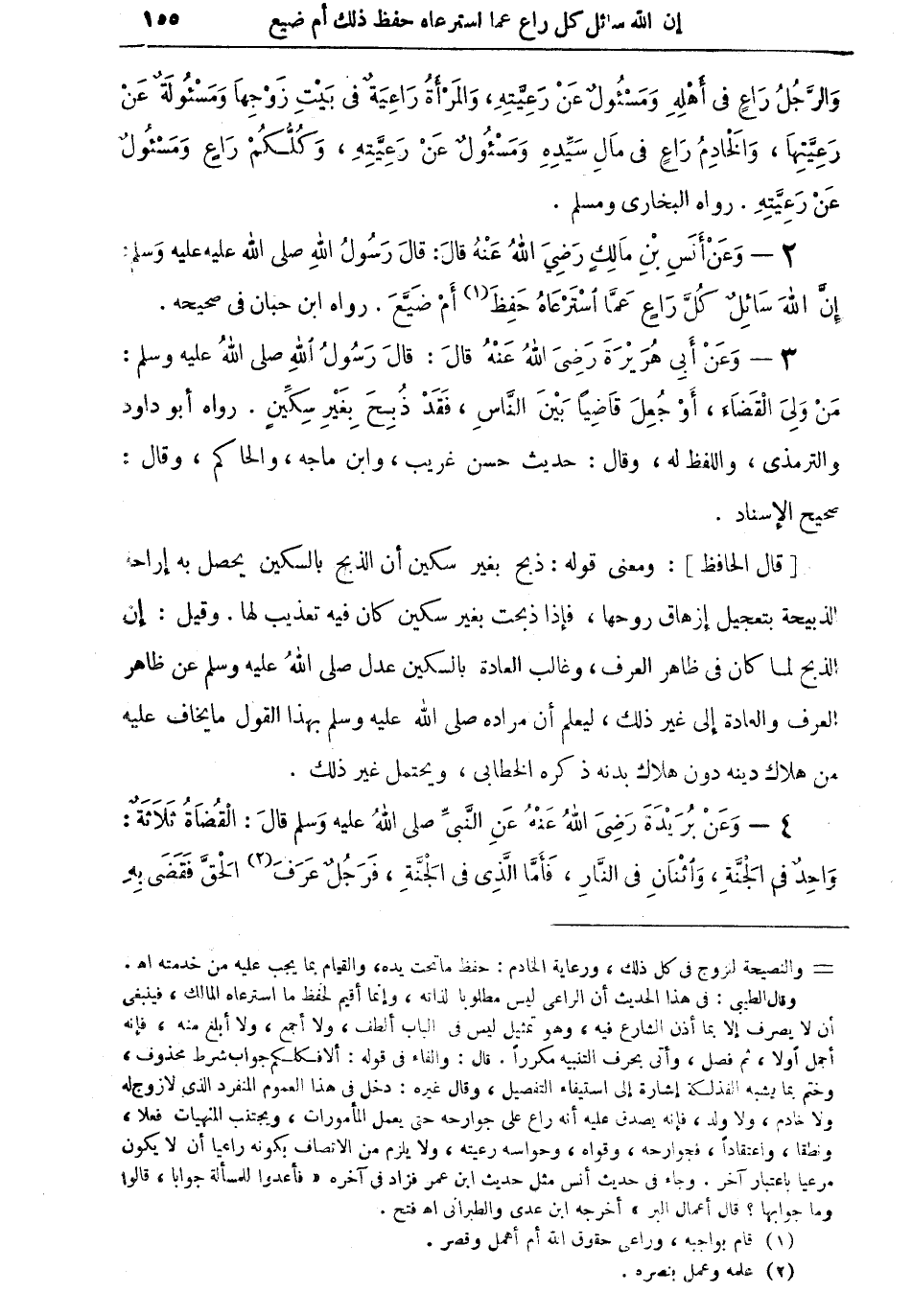 2 - وعن أنس بن مالك رضي الله عنه قال: قال رسول الله صلى الله عليه وسلم: "إن الله سائلٌ كلَّ راعٍ عما استرعاهُ حَفِظَ (¬1) أم ضَيَّعَ" رواه ابن حبان في صحيحه.