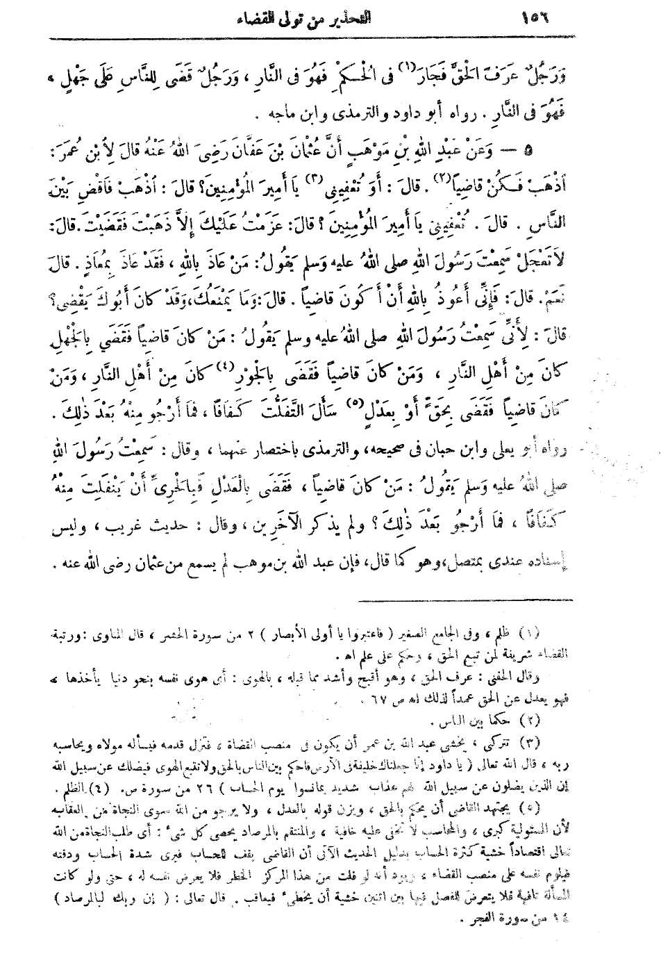 5 - وعن عبد الله بن مَوْهَبٍ أن عثمان بن عفان رضي الله عنه قال لابن عمر: "اذهب فكن قاضياً (¬2). قال: أوَ تُعْفِيني (¬3) يا أمير المؤمنين؟ قال: اذهب فاقضِ بين الناس. قال: تُعْفِيني يا أمير المؤمنين؟ قال: عَزمْتُ عليك إلا ذهبت فقضيت. قال: لا تَعْجَلْ سمعت رسول الله صلى الله عليه وسلم يقول: مَنْ عاذَ بالله، فقد عاذ بمُعاذٍ. قال نعم. قال: فإني أعوذ بالله أن أكون قاضياً. قال: وما يمنعك، وقد كان أبوك يقضي؟ قال: لأني سمعتُ رسول الله صلى الله عليه وسلم يقولُ: مَنْ كان قاضياً، فقضى بالجهلِ كان من أهل النار، ومن كان قاضياً فقضى بالجور (¬4) كان من أهل النار، ومن كان قاضياً، فقضى بحقٍ أو بعدلٍ (¬5)