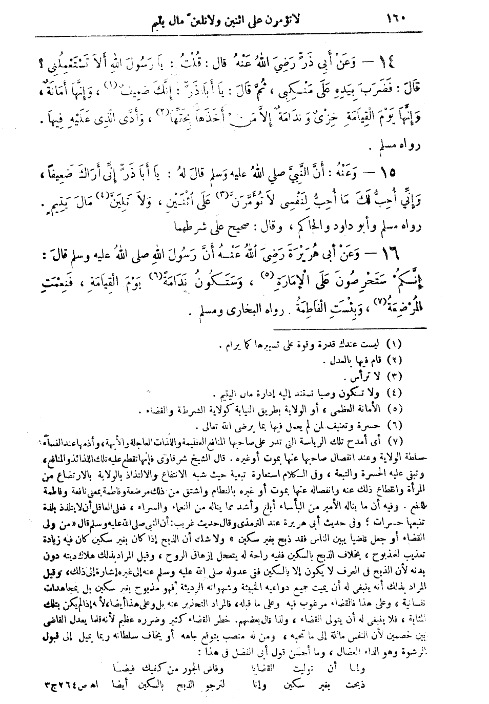 15 - وعنه: "أن النبي صلى الله عليه وسلم قال له: يا أبا ذر إني أراك ضعيفاً، وإني أحب لك ما أحبُ لنفس لا تُؤمَّرَنَّ (¬3) على اثنين، ولا تَلِيَنَّ (¬4) مال يتيمٍ" رواه مسلم وأبو داود والحاكم، وقال: صحيح على شرطهما.