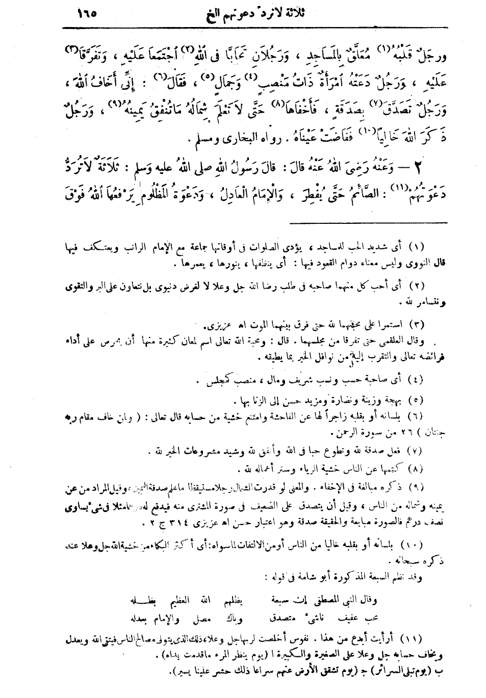(¬10) بلسانه أو بقلبه خالياً من الناس أو من الالتفات لما سواه: أي أكثر البكاء من خشية الله جل وعلا عند ذكره سبحانه، وقد نظم السبعة المذكورة أبو شامة في قوله: