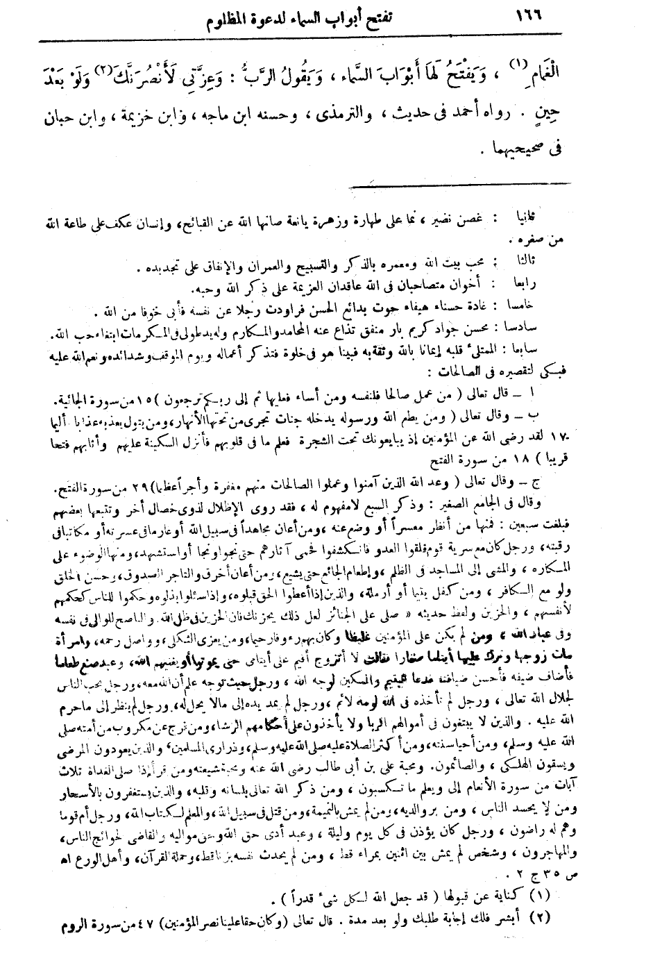 الغمام (¬1)، ويفتح لها أبواب السماء، ويقول الربُّ: وعزتي لأنصرنك (¬2)، ولو بعد حينٍ" رواه أحمد في حديث، وحسنه ابن ماجة، وابن خزيمة، وابن حبان في صحيحيهما.