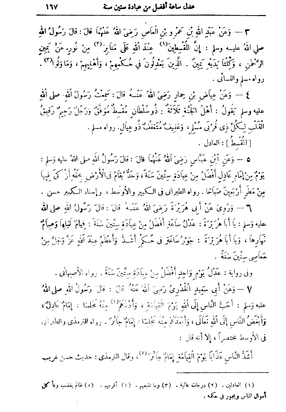 5 - وعن ابن عباس رضي الله عنهما قال: قال رسول الله صلى الله عليه وسلم: "يومٌ من إمامٍ عادلٍ أفضلُ من عبادة ستين سنةً، وحدٌّ يُقامُ في الأرض بحقه أزكى فيها من مَطَرٍ أربعين صباحاً" رواه الطبراني في الكبير والأوسط، وإسناد الكبير حسن.