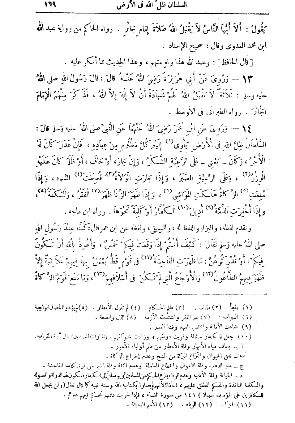 14 - ورويَ عن ابن عمر رضي الله عنهما عن النبي صلى الله عليه وسلم قال: "السلطانُ ظِلُّ الله في الأرض يأوي (¬1) إليه كُلُّ مظلومٍ من عباده، فإن عَدَلَ كان لهُ الأجرُ، وكان - يعني - على الرعية الشُّكُرُ، وإن جار، أو حَافَ، أو ظَلَمَ كان عليه الوزرُ (¬2)، وعلى الرعية الصبرُ، وإذا جارت الولاةُ (¬3) قُحطتْ (¬4) السماء، وإذا مُنعتِ (¬5) الزكاة هلكت المواشي (¬6)،