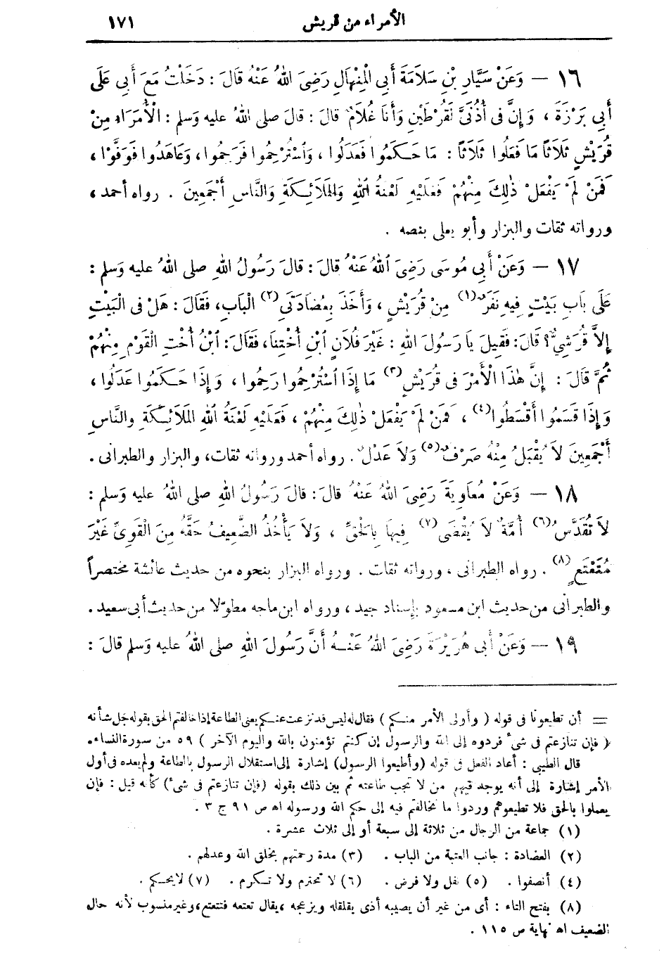16 - وعن سَيَّارِ بن سلامة أبي المنهال رضي الله عنه قال: "دخلت مع أبي على أبي بَرْزَةَ، وإن في أذني لقرطين وأنا غلامٌ قال: قال صلى الله عليه وسلم: الأمراء مِنْ قريش ثلاثاً ما فعلوا ثلاثاً: ما حكموا فعدلوا، واسترحموا فرحموا، وعاهدوا فَوَفَّوْا، فمن لم يفعل ذلك منهم فعليه لعنةُ الله والملائكة والناس أجمعين" رواه أحمد، ورواته ثقات والبزار وأبو يعلى بنصه.