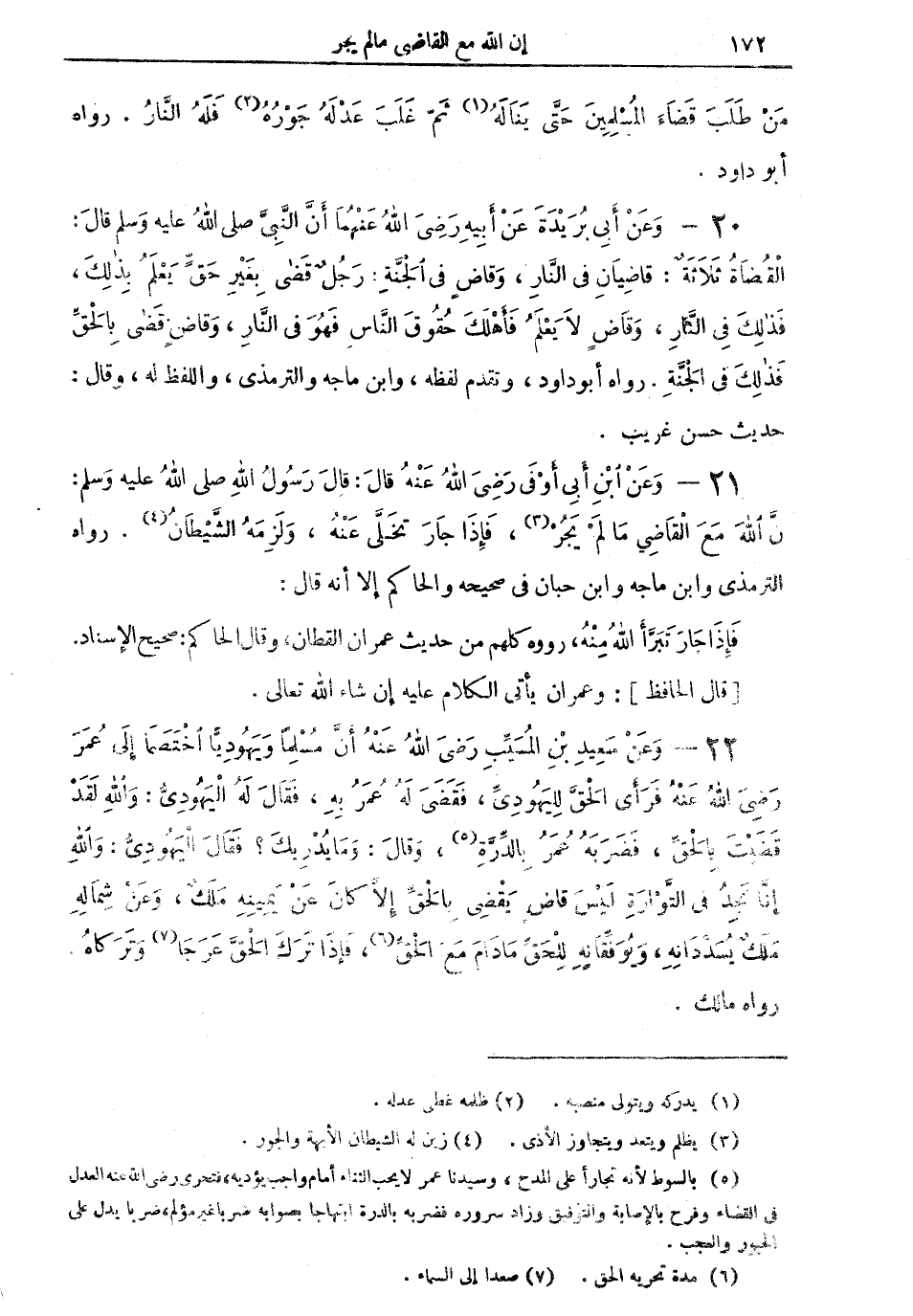 21 - وعن ابن أبي أوفى رضي الله عنه قال: قال رسول الله صلى الله عليه وسلم: "إن الله مع القاضي ما لم يَجُرْ (¬3)، فإذا جَارَ تخلى عنه، ولَزِمَهُ الشيطان (¬4) " رواه الترمذي وابن ماجة وابن حبان في صحيحه والحاكم إلا أنه قال: "فإذا جار تبرأ الله منه" رووه كلهم من حديث عمران القطان، وقال الحاكم: صحيح الإسناد.