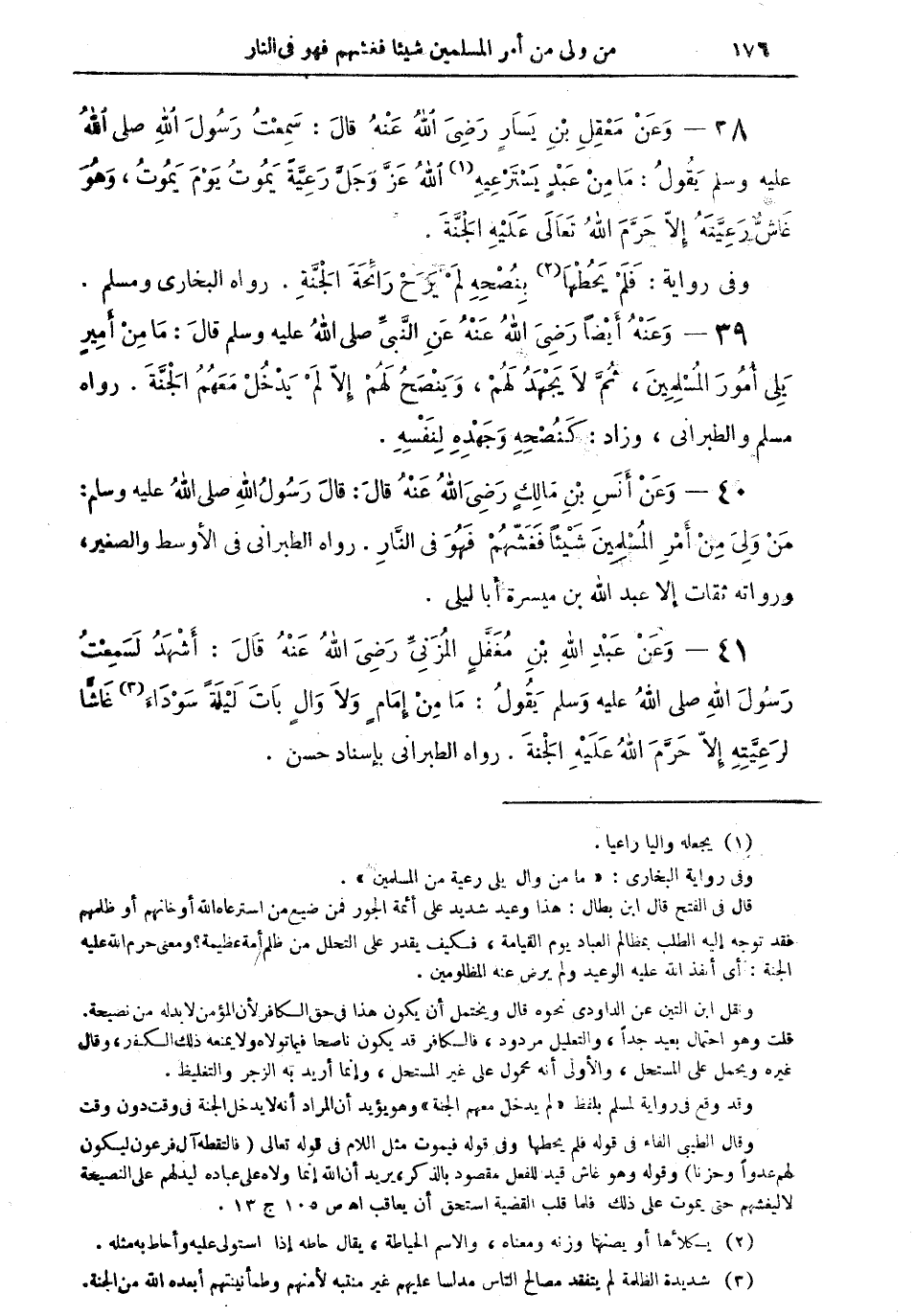 39 - وعنه أيضاً رضي الله عنه عن النبي صلى الله عليه وسلم قال: "ما من أميرٍ يلي أمور المسلمين، ثم لا يجهدُ لهم، وينصحُ لهم إلا لم يدخل معهم الجنة" رواه مسلم والطبراني، وزاد: كنصحهِ وجهدهِ لنفسه.