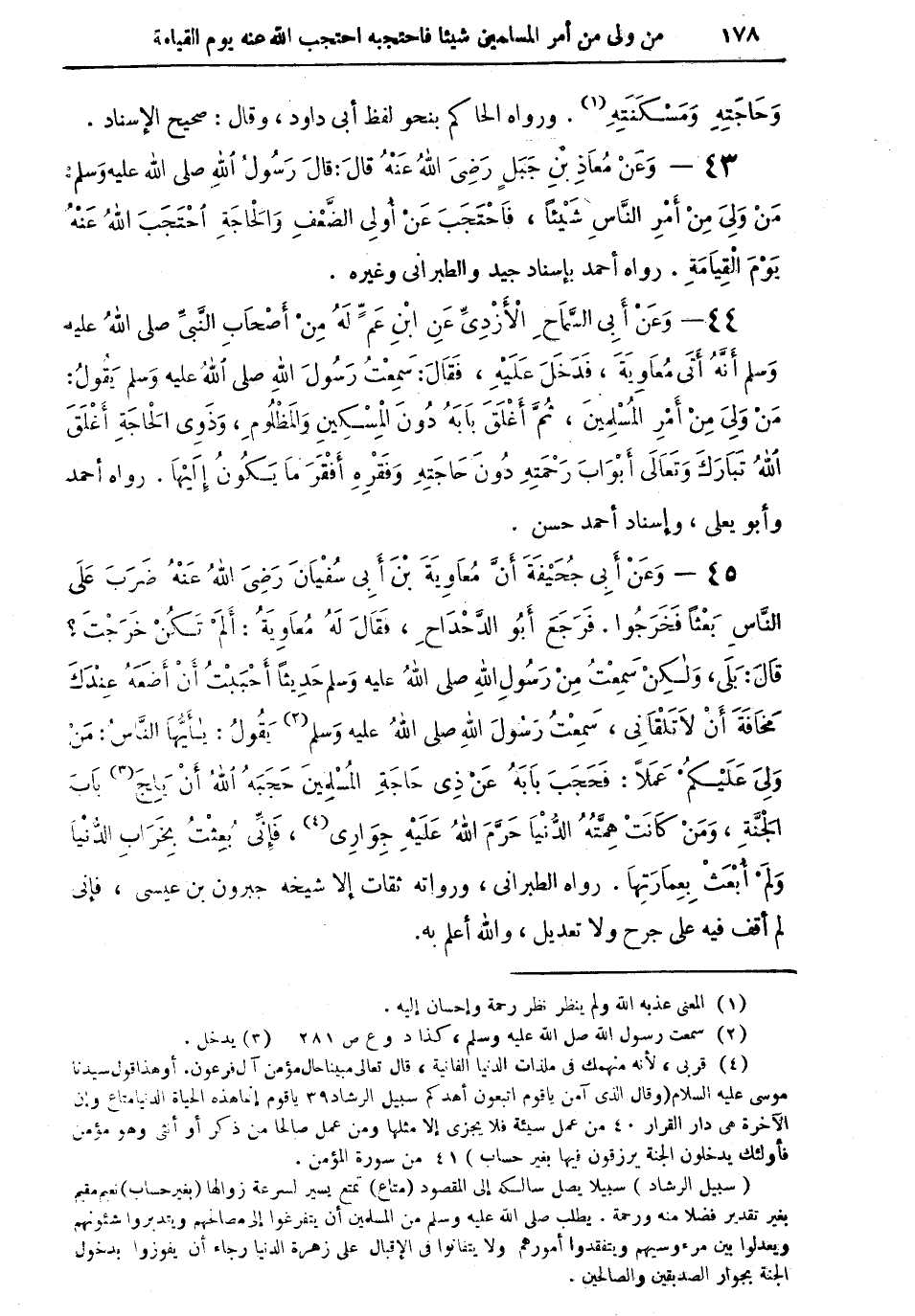 43 - وعن معاذ بن جبل رضي الله عنه قال: قال رسول الله صلى الله عليه وسلم: "من وَلِيَ من أمْرِ الناس شيئاً، فاحْتَجَبَ عن أولِي الضَّعْفِ والحاجةِ احْتَجَبَ الله عنهُ يوم القيامة" رواه أحمد بإسناد جيد والطبراني وغيره.