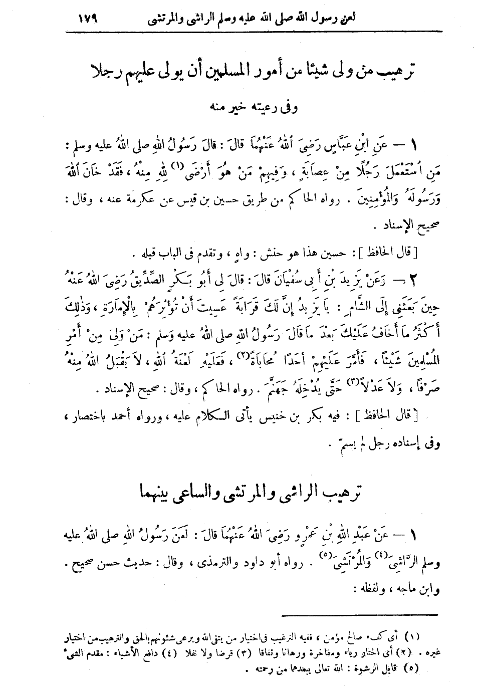 1 - عن عبد الله بن عمروٍ رضي الله عنهما قال: "لعن رسول الله صلى الله عليه وسلم الراشيَ (¬4) والمرتشيَ (¬5) " رواه أبو داود والترمذي، وقال: حديث حسن صحيح، وابن ماجة ولفظه: