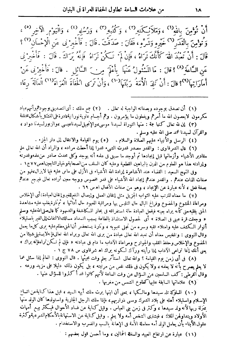 [من علامات الساعة تطاول الحفاة العراة في البنيان] أن تؤمن بالله (¬1)، وملائكته (¬2)، وكتبه (¬3)، ورسله (¬4)، واليوم الآخر (¬5)، وتؤمن بالقدر (¬6)