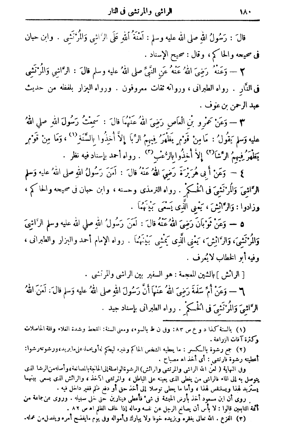 2 - وعنه رضي الله عنه عن النبي صلى الله عليه وسلم قال: "الراشي والمرتشي في النار" رواه الطبراني، ورواته ثقات معروفون، ورواه البزار بلفظه من حديث عبد الرحمن بن عوف.