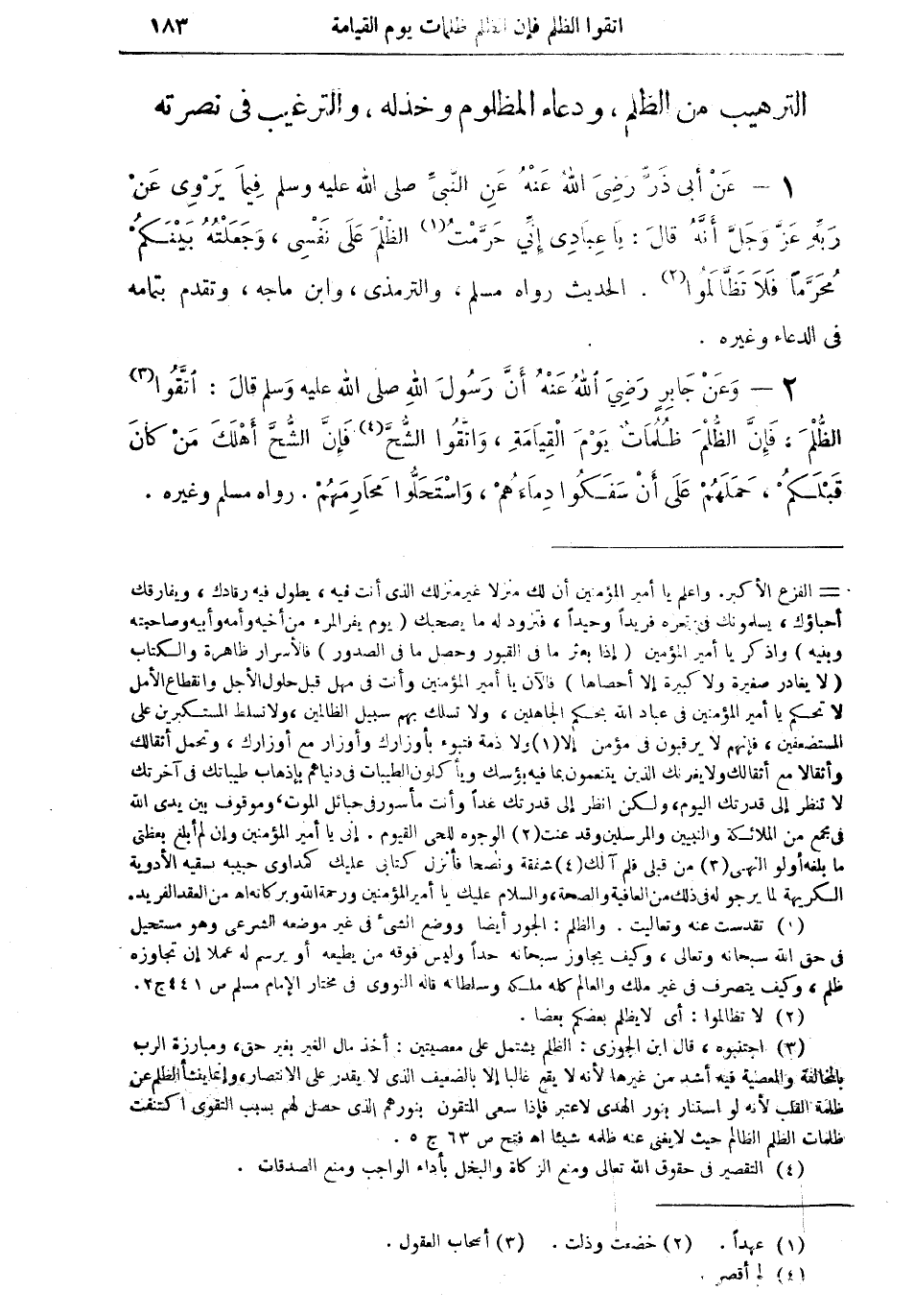 1 - عن أبي ذرٍ رضي الله عنه عن النبي صلى الله عليه وسلم: "فيما يَرْوِي عن ربه عز وجل أنه قال: يا عبادي إني حرمت (¬1) الظلم على نفسي، وجعلتهُ بينكم مُحَرَّماً فلا تَظَّالَمُوا (¬2) " الحديث رواه مسلم والترمذي وابن ماجة، وتقدم بتمامه في الدعاء وغيره.