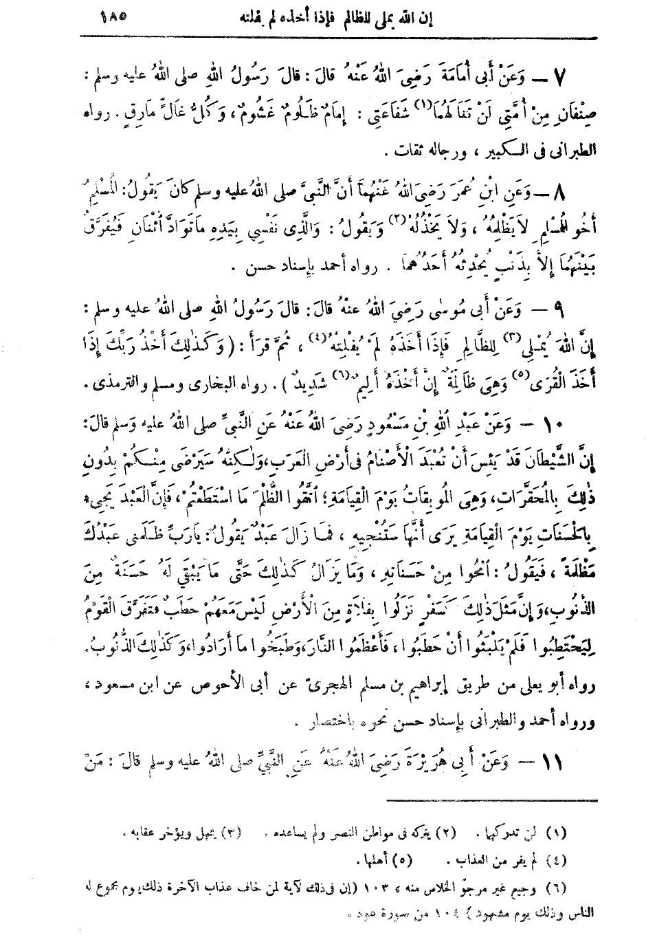 10 - وعن عبد الله بن مسعود رضي الله عنه عن النبي صلى الله عليه وسلم قال: "إن الشيطان قد يئس أن تُعبدَ الأصنام في أرض العرب، ولكنه سيرضى منكم بدون ذلك بالمُحَقَّرَاتِ، وهي الموبقات يوم القيامة؛ اتقوا الظلم ما استطعتم، فإن العبد يجئ بالحسنات يوم القيامة يرى أنها سَتُنْجِيهِ، فمازال عَبْدٌ يقول: يا رب ظلمني عبدك مظلمةً، فيقول: امحوا من حسناته، ومايزالُ كذلك حتى ما يبقى له حسنةٌ من الذنوب، وإن مثل ذلك كَسَفْرٍ نزلوا بفلاةٍ من الأرض ليس معهم حطبٌ فتفرق القومُ ليحتطبوا فلم يلبثوا أن حطبوا، فأعظموا النار، وطبخوا ما أرادوا، وكذلك الذنوب" رواه أبو يعلى من طريق إبراهيم بن مسلم الهجري عن أبي الأحوص عن ابن مسعود، ورواه أحمد والطبراني بإسناد حسن نحوه باختصار.