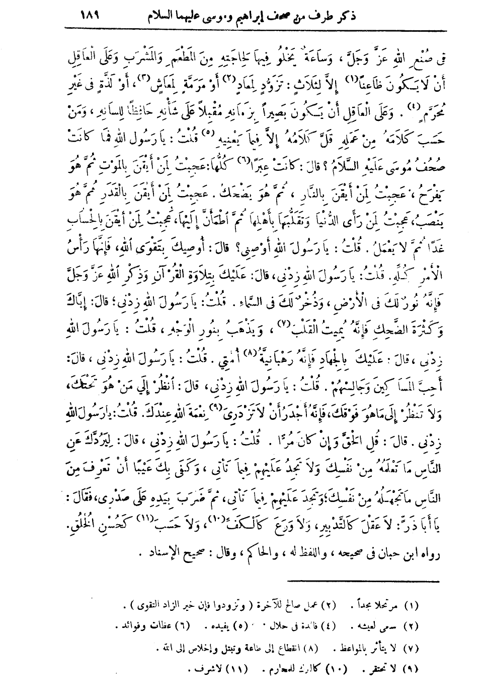 أو لذَّةٍ في غير مُحَرَّمٍ (¬4) وعلى العاقل أن يكون بصيراً بزمانه مُقبلاً على شأنهِ حافظاً للسانه، ومن حَسَبَ كلامهُ من عمله قَلَّ كَلامُهُ إلا فيما يعنيه (¬5) قلتُ: يا رسول الله فما كانت صحفُ موسى عليه السلام؟ قال: كانت عِبَراً (¬6) كلها: عجبتُ لمن أيقن بالموتَ ثم هو يفرحُ، عجبتُ لمن أيقنَ بالنار، ثم هو يضحكُ. عجبتُ لمن أيقنَ بالقدرِ ثم هو ينصبُ، عجبتُ لمن رأى الدنيا وتقلبها بأهلها ثم اطمأن إليها، عجبتُ لمن أيقنَ بالحساب غداً ثم لا يعمل. قلت: يا رسول الله أوصني. قال: أوصيك بتقوى الله، فإنها رأسُ الأمر كله. قلتُ يا رسول الله زدني، قال: عليك بتلاوة القرآن وذكر الله عز وجل، فإنه نور لك في الأرض، وذُخرٌ لك في السماء. قلت يا رسول الله: زدني؛ قال: إياك وكثرة الضحك فإنه يُميتُ القلب (¬7)، ويذهبُ بنورِ الوجه، قُلتُ: يا رسول الله زدني، قال: عليك بالجهاد فإنه رهبانيةُ (¬8) أمتي. قلت يا رسول الله زدني، قال: أحبَّ المساكين وجالسهم. قلتُ يا رسول الله زدني، قال: انظر إلى من هو تحتك، ولا تنظر إلى ما هو فوقك، فإنه أجدر أن لا تزدري (¬9) نعمة الله عندك. قلت: يا رسول الله زدني، قال: قل الحق وإن كان مُرّاً. قلت: يا رسول الله زدني، قال: لِيَرُدَّكَ عن الناس ما تعملهُ من نفسك ولا تجدُ عليهم فيما تأتي، وكفى بك عيباً أن تعرف من الناس ما تجهله من نفسك؛ وتجدَ عليهم فيما تأتي، ثم ضرب بيده على صدري، فقال: يا أبا ذرٍ: لا عَقْلَ كالتدبيرِ، ولا وَرَع كالكَفِّ (¬10)، ولا حَسَبَ (¬11)