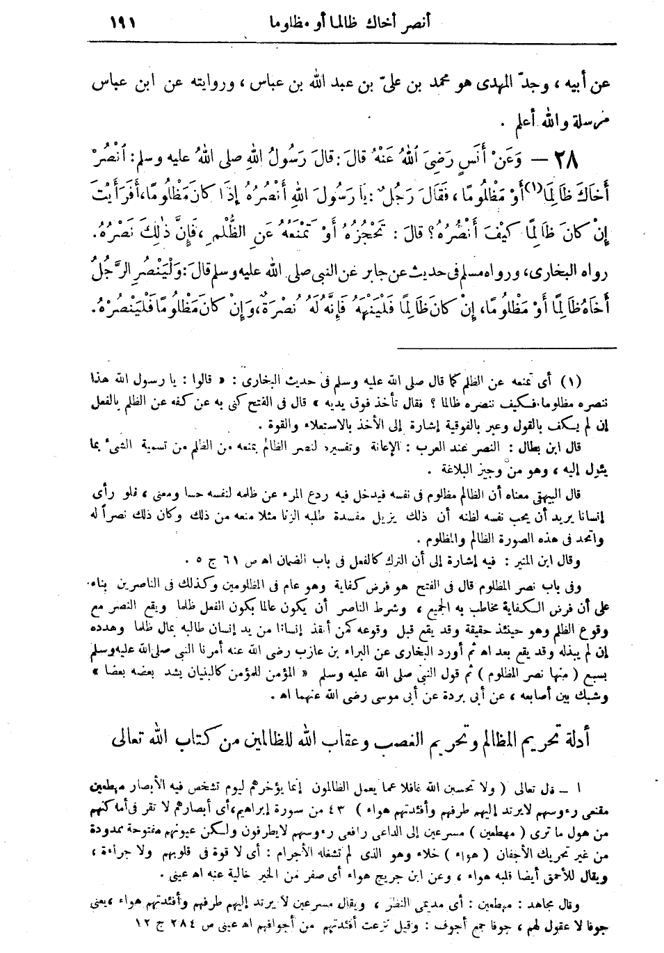 أو مظلوماً، فقال رجلٌ: يا رسول الله أنصرهُ إذا كان مظلوماً، أفرأيتَ إن كان ظالماً كيف أنْصُرُهُ؟ قال: تَحْجُزُهُ أو تمنعهُ عن الظلم، فإن ذلك نصرهُ" رواه البخاري ورواه مسلم في حديث عن جابر عن النبي صلى الله عليه وسلم قال: وَلْيَنْصُرِ الرجلُ أخاهُ ظالماً أو مظلوماً، إن كان ظالماً فَلْيَنْهَهُ فإنه له نُصْرَةٌ، وإن كان مظلوماً فليَنْصُرْهُ".