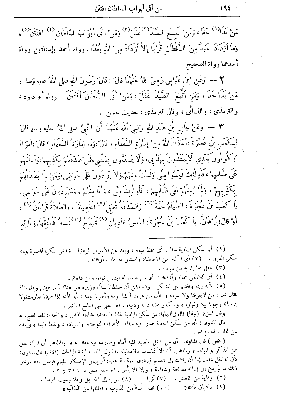2 - وعن ابن عباس رضي الله عنهما قال: قال رسول الله صلى الله عليه وسلم: "من بدا جفا، ومن اتبع الصيد غفل، ومن أتى السلطان افتتن" رواه أبو داود والترمذي والنسائي، وقال الترمذي: حديث حسن.