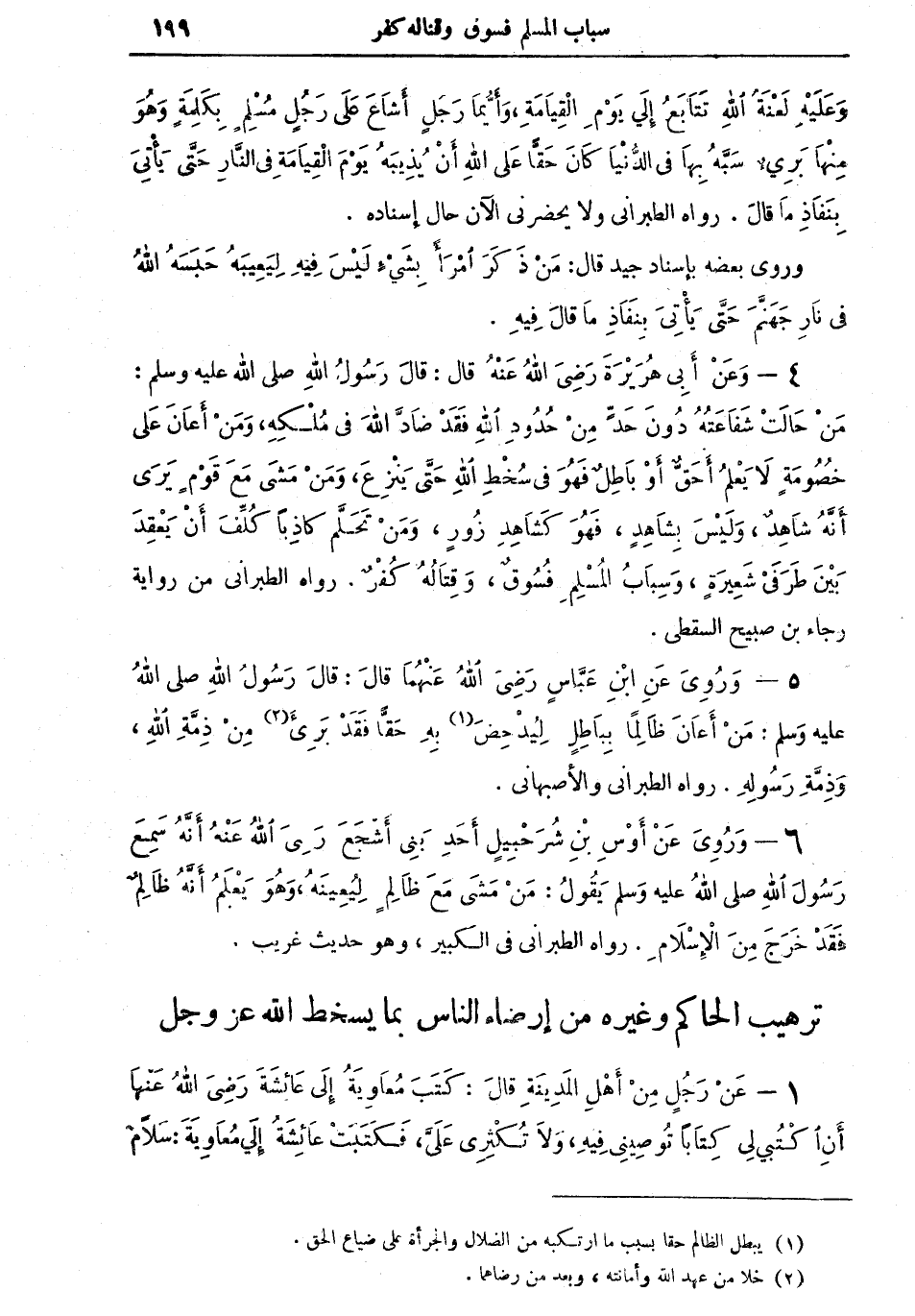 6 - ورويَ عن أوس بن شُرحبيلٍ أحد بني أشجع رضي الله عنه أنه سمع رسول الله صلى الله عليه وسلم يقول: "من مشى مع ظالمٍ لِيُعِينَهُ، وهو يعلمُ أنه ظالمٌ فقد خرجَ من الإسلام" رواه الطبراني في الكبير، وهو حديث غريب.