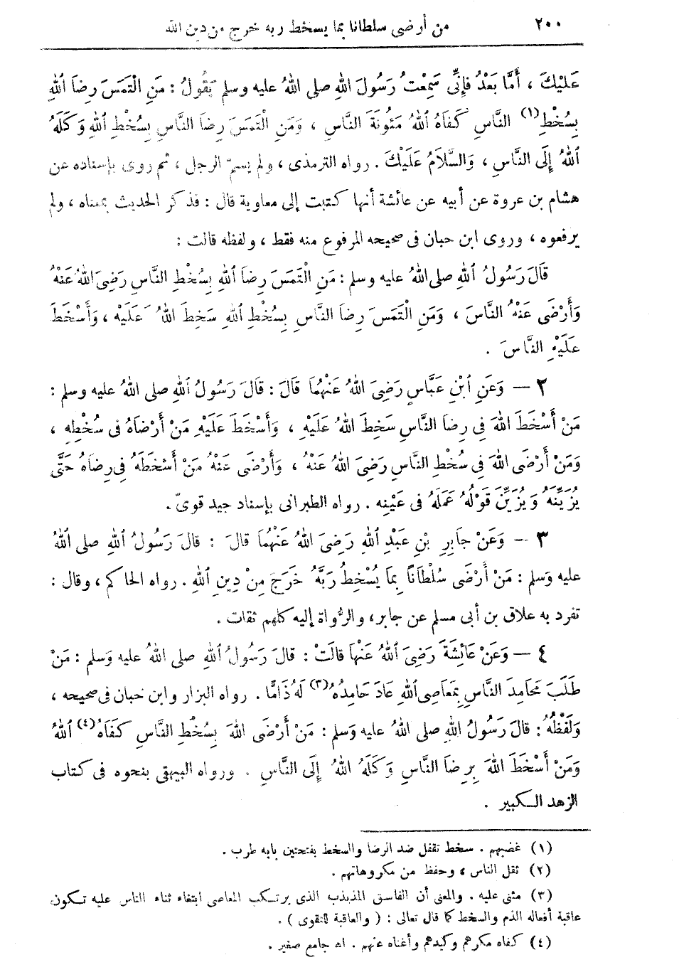 3 - وعن جابر بن عبد الله رضي الله عنهما قال: قال رسول الله صلى الله عليه وسلم: "من أرضى سُلطاناً بما يُسْخِطُ ربهُ خرج من دين الله" رواه الحاكم، وقال: تفرد به علاق بن أبي مسلم عن جابر، والرواة إليه كلهم ثقات.