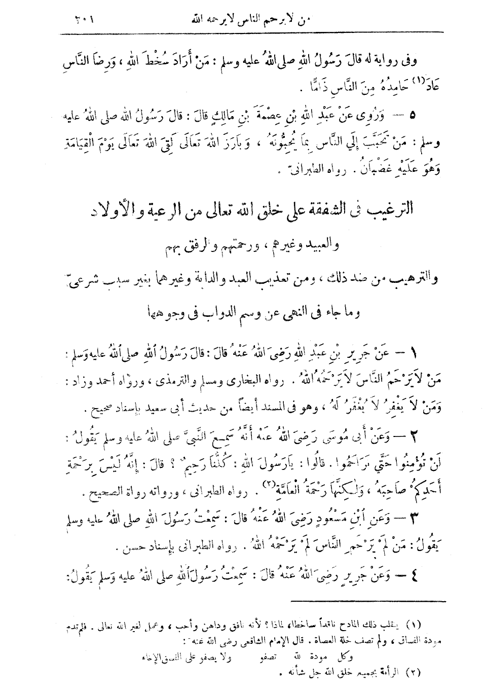 1 - عن جرير بن عبالله رضي الله عنه قال: قال رسول الله صلى الله عليه وسلم: "من لا يَرْحَمُ الناسَ لا يَرْحَمُهُ الله" رواه البخاري ومسلم والترمذي، ورواه أحمد وزاد: ومن لا يغفرُ لا يُغفرُ له، وهو في المسند أيضاً من حديث أبي سعيد بإسناد صحيح.