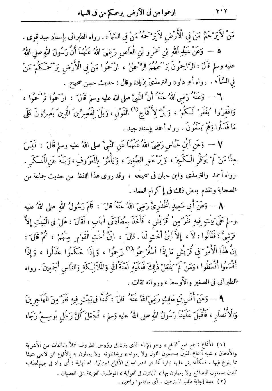 5 - وعن عبد الله بن عمرو بن العاص رضي الله عنهما أن رسول الله صلى الله عليه وسلم قال: "الراحمون يرحمهم الرحمن، ارحموا من في الأرض يرحمكم من في السماء" رواه أبو داود والترمذي بزيادة وقال: حديث حسن صحيح.