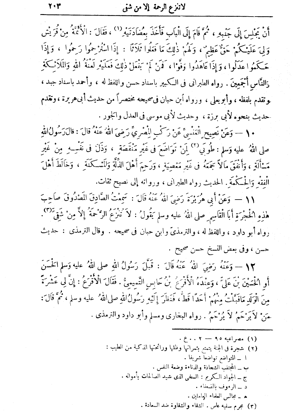12 - وعنه رضي الله عنه قال: "قَبَّلَ رسول الله صلى الله عليه وسلم الحَسَنَ أو الحُسَيْنَ بن عليٍ، وعنده الأقرعُ بن حابسٍ التميمي. فقال الأقرعُ: إن لي عَشرةً من الولد ما قَبَّلْتُ منهم أحداً قطُّ، فنظر إليه رسول الله صلى الله عليه وسلم ثم قال: مَنْ لا يَرْحَمُ لا يُرْحَمُ" رواه البخاري ومسلم وأبو داود والترمذي.