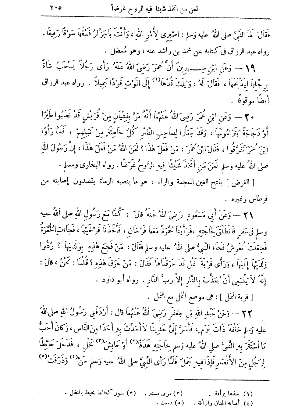 20 - وعن ابن عمر رضي الله عنهما" أنه مرَّ بفتيانٍ من قريشٍ قد نَصَبُوا طيراً أو دجاجةً يترامونها، وقد جعلوا لصاحب الطير كلَّ خاطئةٍ من نَبْلِهمْ، فلما رأوا ابن عمر تفرقوا، فقال ابن عمر: من فعل هذا؟ لعن الله من فعل هذا، إن رسول الله صلى الله عليه وسلم لعن من اتخذ شيئاً فيه الروحُ غَرَضاً" رواه البخاري ومسلم.