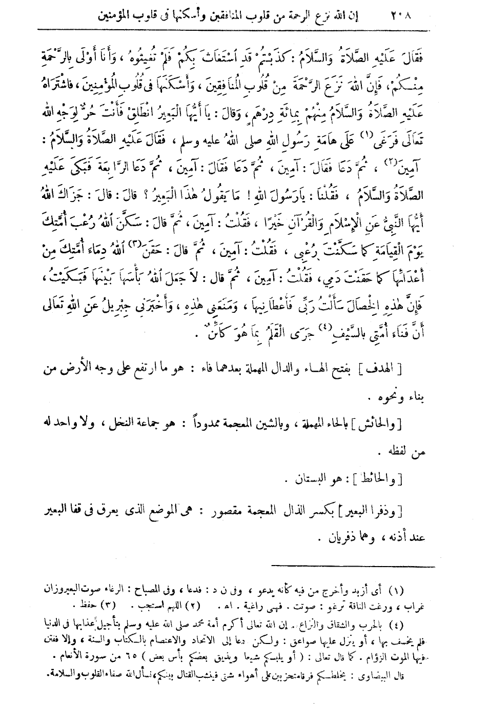 فقال عليه الصلاة والسلام: كذبتُم قد استغاث بكم فلم تُغِيثُوهُ، وأنا أولى بالرحمة منكم، فإن الله نزع الرحمة من قلوب المنافقين، وأسكنها في قلوب المؤمنين، فاشتراه عليه الصلاة والسلام منهم بمائة درهمٍ، وقال: يا أيها البعير انطلق فأنت حُرٌّ لوجه الله تعالى فَرَغَى (¬1) على هامة رسول الله صلى الله عليه وسلم، فقال عليه الصلاة والسلام: آمين (¬2)، ثم دعا فقال: آمين، ثم دعا فقال: آمين، ثم دعا الرابعة فبكى عليه الصلاة والسلام، فقلنا: يا رسول الله! ما يقول هذا البعير؟ قال: قال جزاك الله أيها النبي عن الإسلام والقرآن خيراً، فقلت: آمين، ثم قال: سَكَّنَ الله رُعْبَ أمتك يوم القيامة كما سَكَّنْتَ رُعْبِي، فقلتُ: آمين، ثم قال: حَقَنَ (¬3) الله دماء أمتك من أعدائها كما حقنت دمي، فقلتُ: آمين، ثم قال: لا جعل الله بأسها بينها فبكيتُ، فإن هذه الخصال سألتُ ربي فأعطانيها، ومنعني هذه، وأخبرني جبريل عن الله تعالى أن فناء أُمتي بالسيف (¬4) جرى القلمُ بما هو كائنٌ".