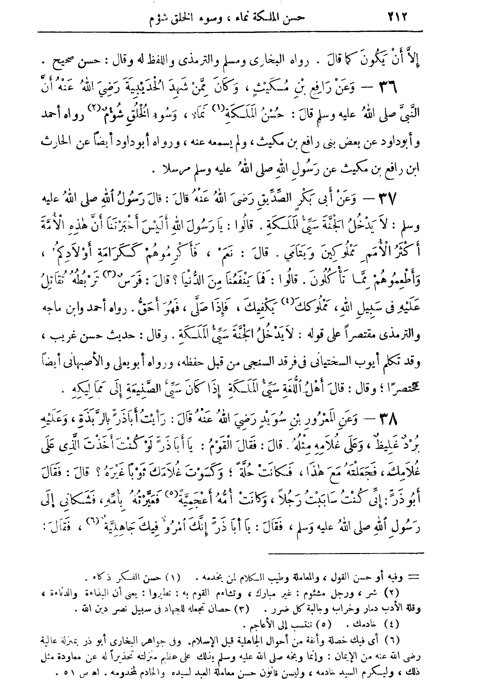 36 - وعن رافع بن مكيثٍ، وكان ممن شهدَ الحديبية رضي الله عنه أن النبي صلى الله عليه وسلم قال: "حُسْنُ الملكةِ (¬1) نماء، وسوء الخلق شؤمٌ (¬2) " رواه أحمد وأبو داود عن بعض بني رافع بن مكيث، ولم يسمعه عنه، ورواه أبو داود أيضاً عن الحارث بن رافع بن مكيث عن رسول الله صلى الله عليه وسلم مرسلاً.