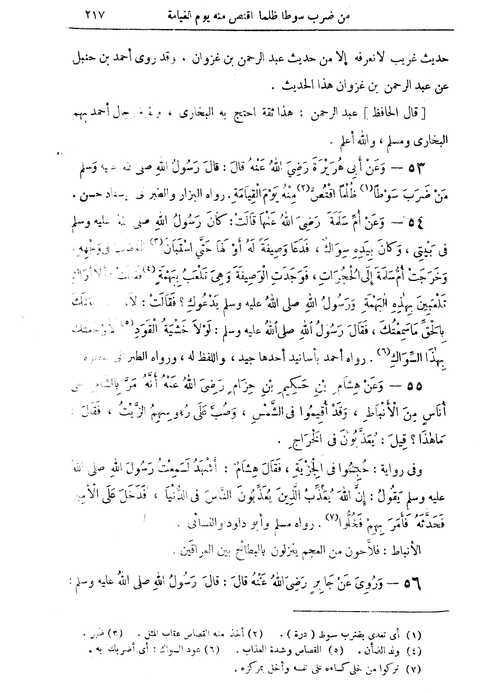 55 - وعن هشام بن حكيم بن حزامٍ رضي الله عنه: "أنه مر بالشام على أُناسٍ من الأنْبَاطِ، وقد أُقيُموا في الشمس، وَصُبَّ على رءوسهم الزيتُ، فقال: ما هذا؟ قيل: يُعذبون في الخَرَاجِ" وفي رواية: "حُبسوا في الجزيةِ، فقال هشام: أشهد لسمعتُ رسول الله صلى الله عليه وسلم يقول: إن الله يُعذب الذين يُعذبون الناس في الدنيا، فدخل على الأمير فَحَدَّثَهُ فأمر بهم فَخُلُّوا (¬7) " رواه مسلم وأبو داود والنسائي.