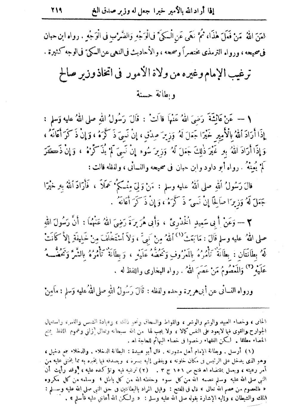 1 - عن عائشة رضي الله عنها قالت: قال رسول الله صلى الله عليه وسلم: "إذا أراد الله بالأمير خيراً جعل له وزير صدقٍ، إن نسيَ ذكَّرَهُ، وإن ذَكَرَ أعانهُ، وإذا أراد الله به غير ذلك جعل له وزير سوء إن نسيَ لم يُذكِّرْهُ، وإن ذكر لم يُعِنْهُ" رواه أبو داود وابن حبان في صحيحه والنسائي، ولفظه قالت: "قال رسول الله صلى الله عليه وسلم: من وَلِيَ منكم عملاً، فأراد الله به خيراً جعل له وزيراً صالحاً إن نسيَ ذَكَّرَهُ، وإن ذكرَ أعانهُ".